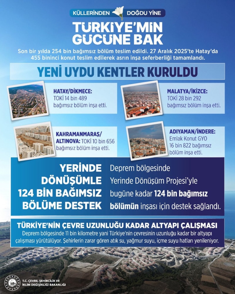 Hatay'da 27 Aralık 2025 tarihinde Cumhurbaşkanı Recep Tayyip Erdoğan'ın katılımıyla gerçekleştirilen son törende tamamlanan ev ve iş yeri sayısı 455 bin 357'ye ulaştı.