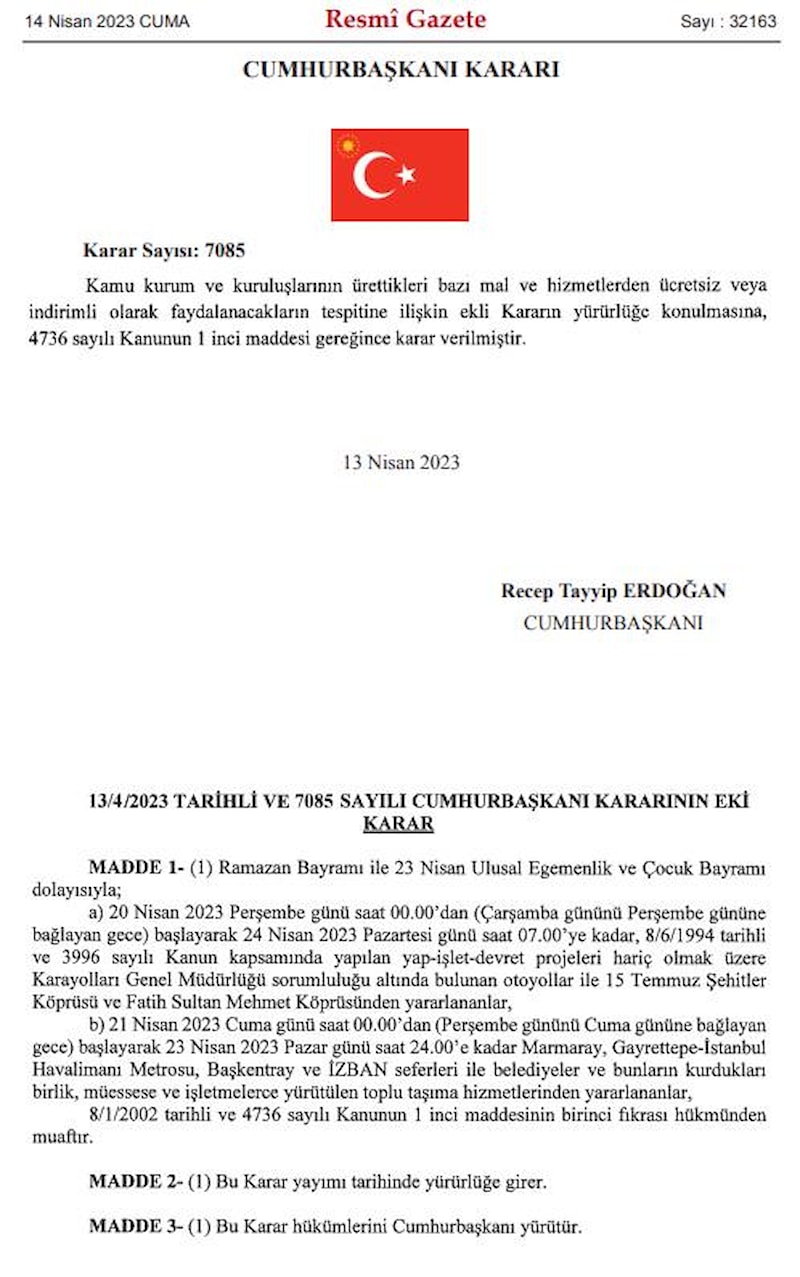 Cumhurbaşkanı Recep Tayyip Erdoğan'ın imzasıyla yayınlanan karara göre; Ramazan Bayramı ve 23 Nisan Ulusal Egemenlik ve Çocuk Bayramı tatili nedeniyle 20 Nisan saat 00.00'dan 24 Nisan saat 07.00'ye kadar, 'yap-işlet-devret' modeliyle yapılan projeler hariç, Karayolları Genel Müdürlüğü sorumluluğu altındaki otoyollar ile 15 Temmuz Şehitler Köprüsü ve Fatih Sultan Mehmet Köprüsü'nden geçişler ücretsiz olacak.