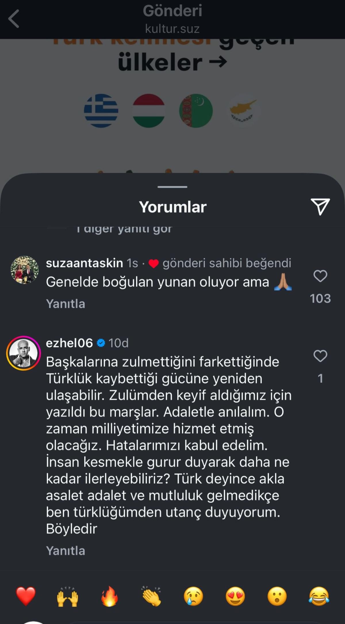 Kültürsüz adlı Instagram hesabının 'Milli marşında Türk kelimesi geçen ülkeler' derleme postuna yorum yapan Ezhel, Yunanistan milli marşı üzerinden Türkiye'yi eleştirdi.