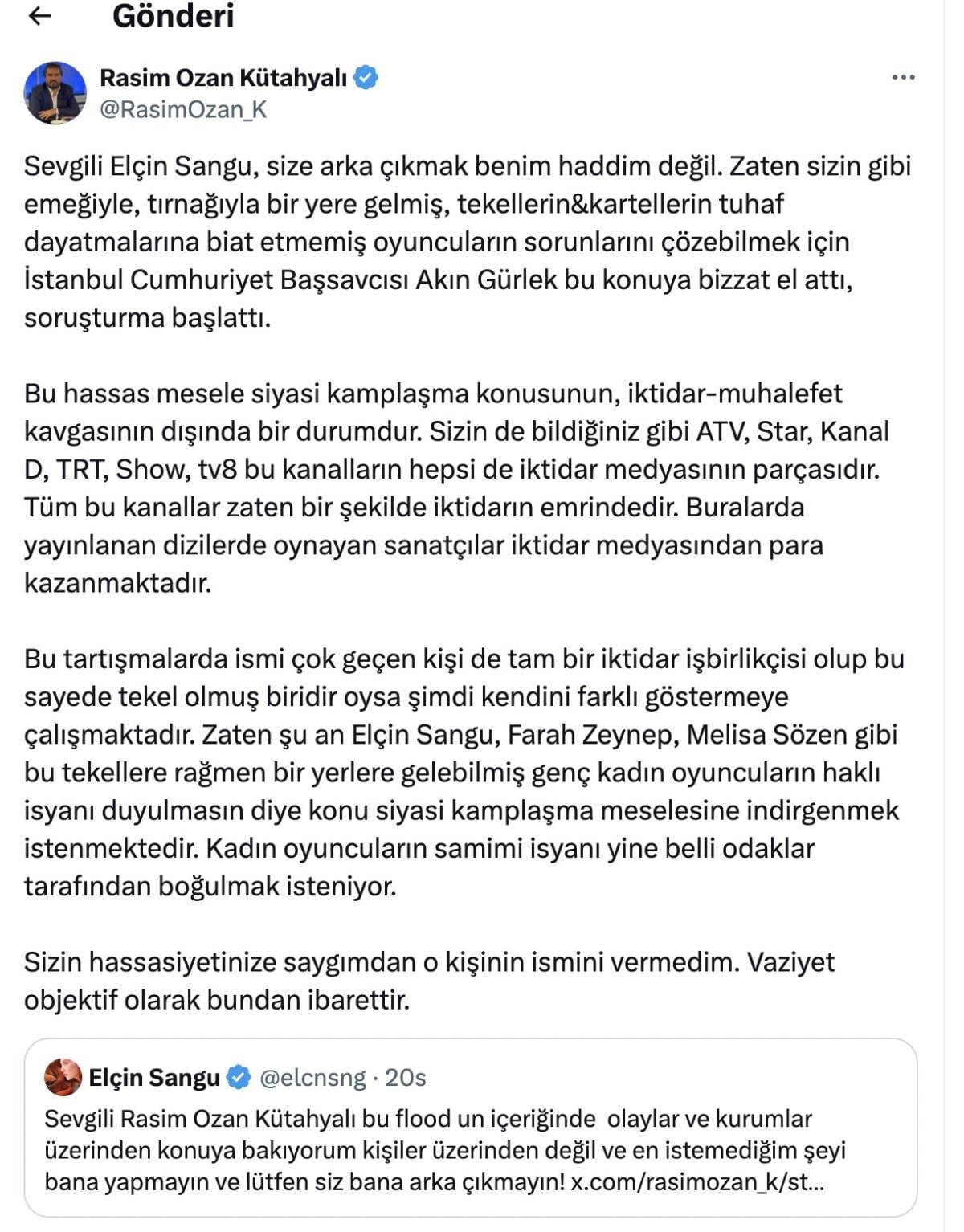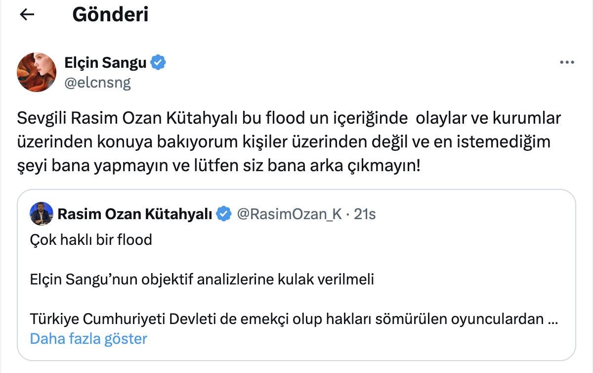 Rasim Ozan Kütahyalı'nın sözlerini alıntılayan Elçin Sangu da yanıt olarak, "Sevgili Rasim Ozan Kütahyalı bu flood'un içeriğinde olaylar ve kurumlar üzerinden konuya bakıyorum kişiler üzerinden değil ve en istemediğim şeyi bana yapmayın ve lütfen siz bana arka çıkmayın!" dedi.