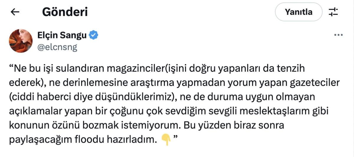 Bu ismlerden birisi olan Elçin Sangu, X hesabından "Ne bu işi sulandıran magazinciler (işini doğru yapanları da tenzih ederek), ne derinlemesine araştırma yapmadan yorum yapan gazeteciler (ciddi haberci diye düşündüklerimiz), ne de duruma uygun olmayan açıklamalar yapan birçoğunu çok sevdiğim sevgili meslektaşlarım gibi konunun özünü bozmak istemiyorum. Bu yüzden biraz sonra paylaşacağım floodu hazırladım." dedi ve çarpıcı açıklamalarda bulundu.