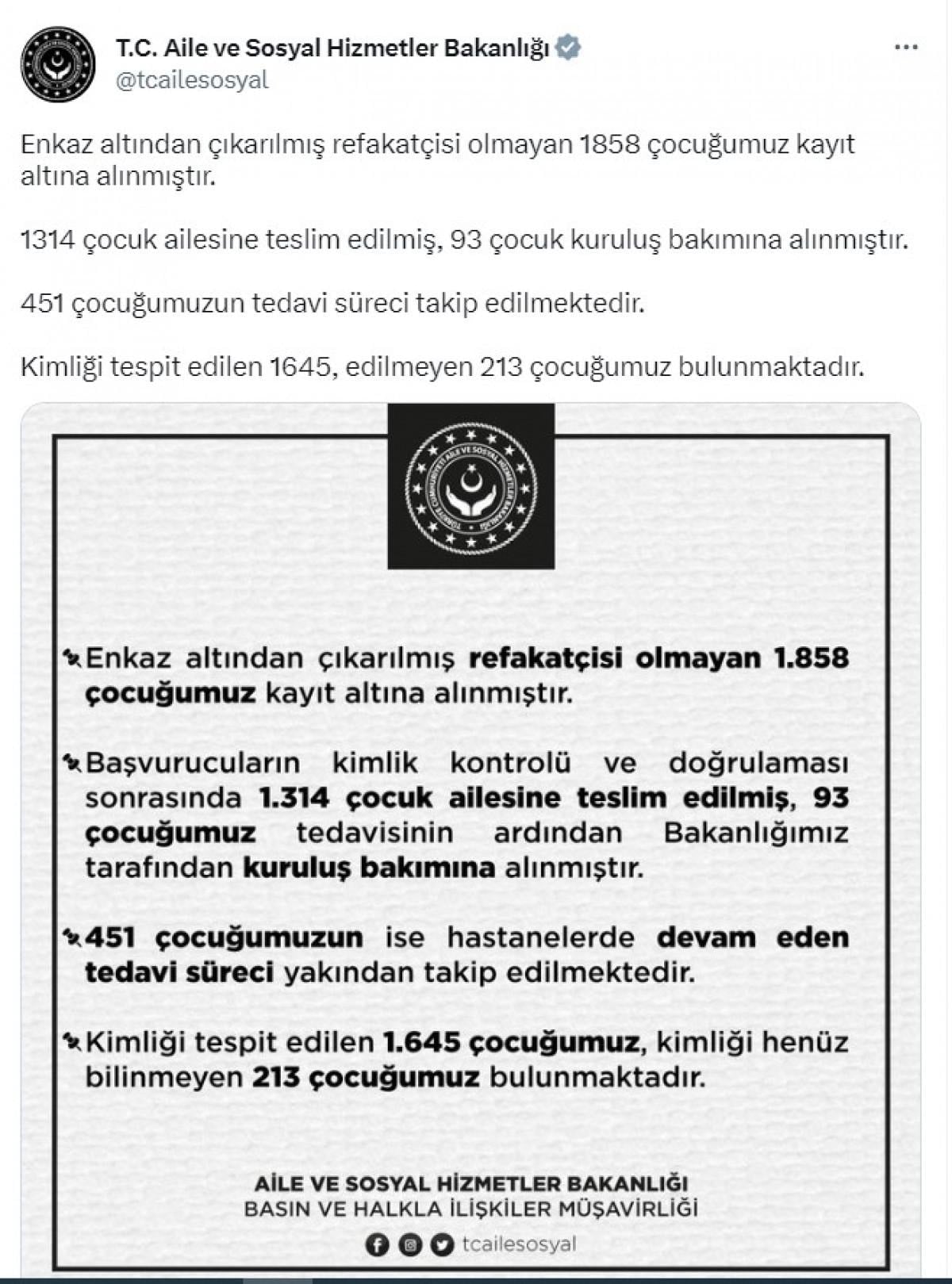 Enkaz altından çıkarılmış refakatçisi olmayan 1858 çocuğumuz kayıt altına alınmıştır. Başvurucunun kimlik kontrolü ve doğrulaması sonucu 1314 çocuk ailesine teslim edilmiş, 93 çocuğumuz kuruluş bakımına alınmıştır, 451 çocuğumuzun ise hastanelerde tedavi süreci yakından takip edilmektedir. Kimliği tespit edilen 1645, edilmeyen 213 çocuğumuz bulunmaktadır.