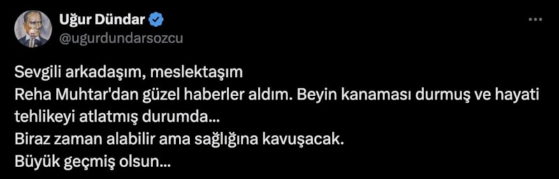 Gazeteci Uğur Dündar, meslektaşı Reha Muhtar'ın beyin kanamasının durduğunu ve hayati tehlikeyi atlattığını söyledi.