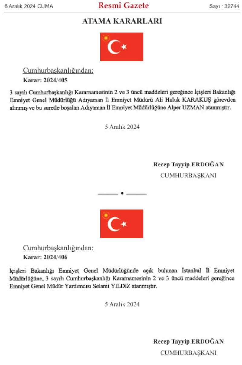 Resmi Gazete'de yayımlanan kararlara göre İstanbul ve Adıyaman emniyet müdürlüğüne yeni atamalar yapıldı.