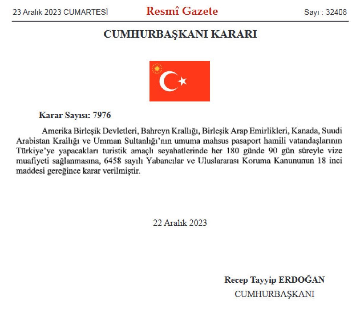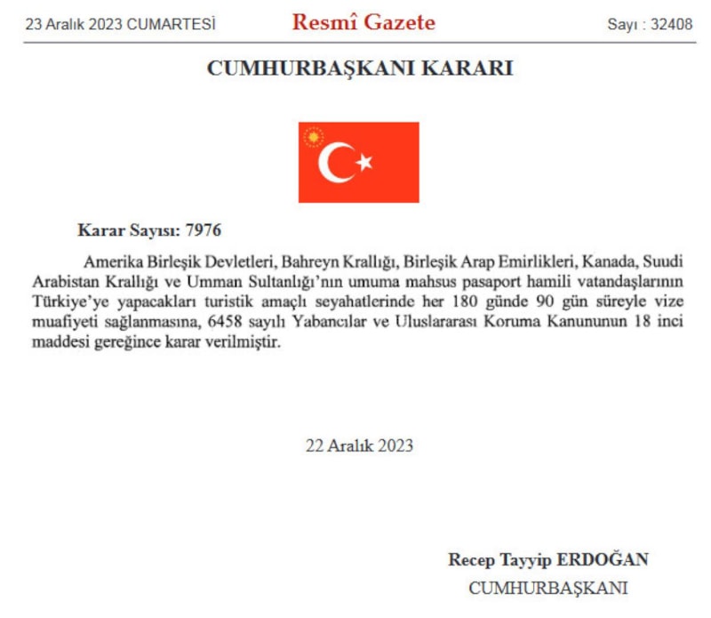 Cumhurbaşkanı Recep Tayyip Erdoğan imzasıyla yayımlanan karara göre, Amerika Birleşik Devletleri, Bahreyn, Birleşik Arap Emirlikleri, Kanada, Suudi Arabistan ve Umman'ın umuma mahsus pasaport hamili vatandaşlarının Türkiye'ye yapacakları turistik amaçlı seyahatlerinde her 180 günde 90 gün süreyle vize muafiyeti sağlanacak.