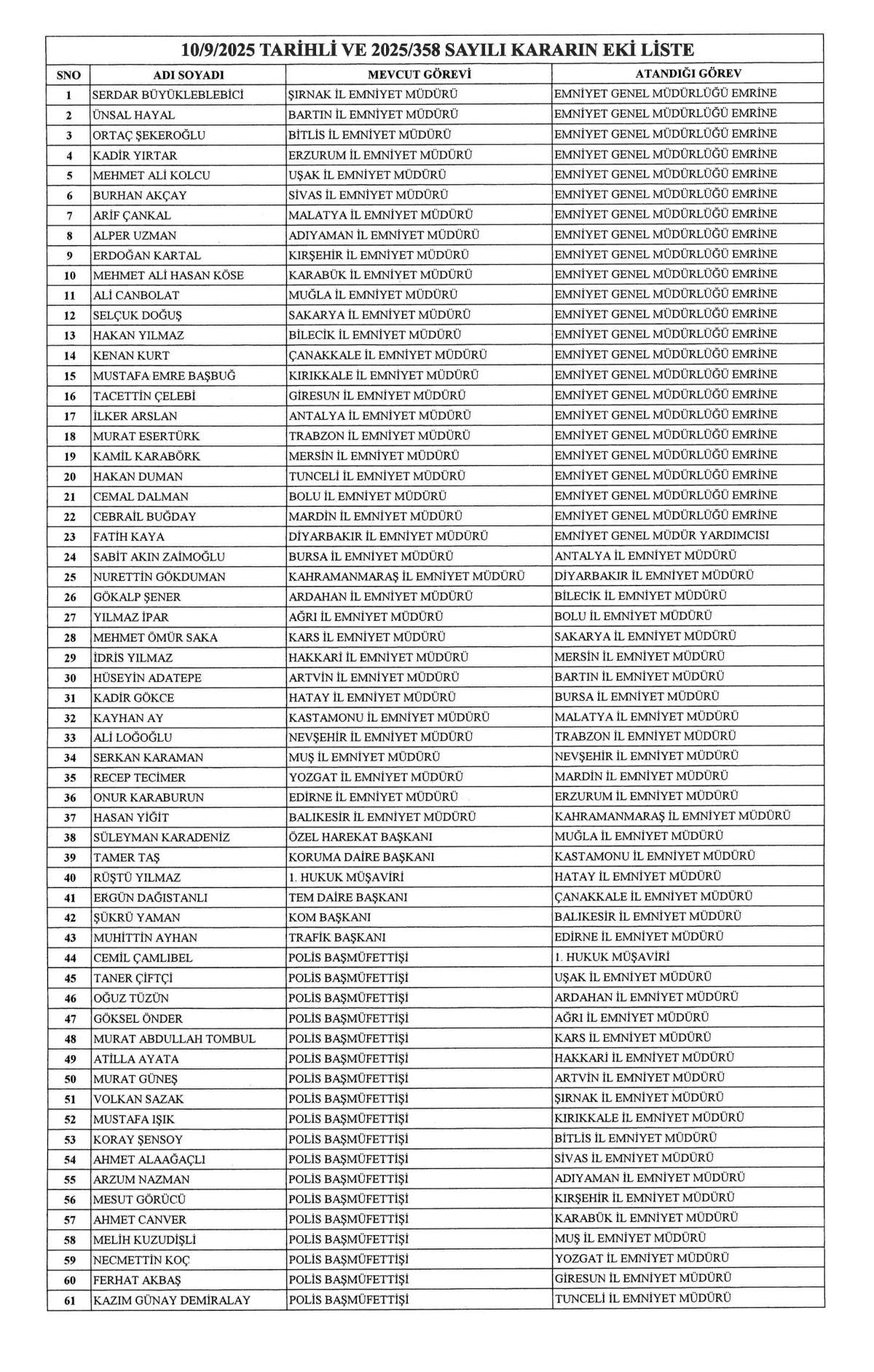 Özel Harekat Başkanı Süleyman Karadeniz, Muğla Emniyet Müdürlüğü'ne; Polis Başmüfettişi Cemil Çamlıbel, 1. Hukuk Müşavirliği'ne getirildi.