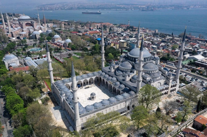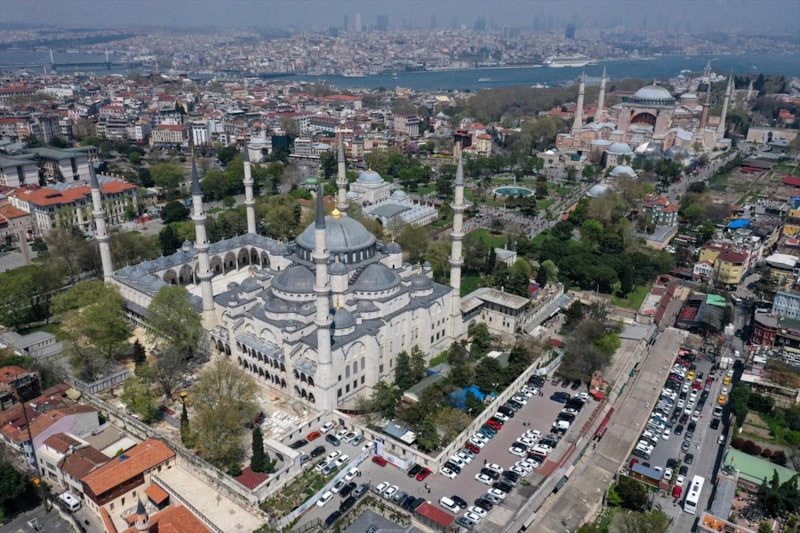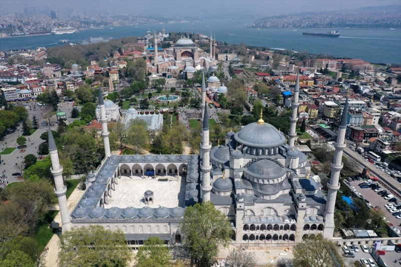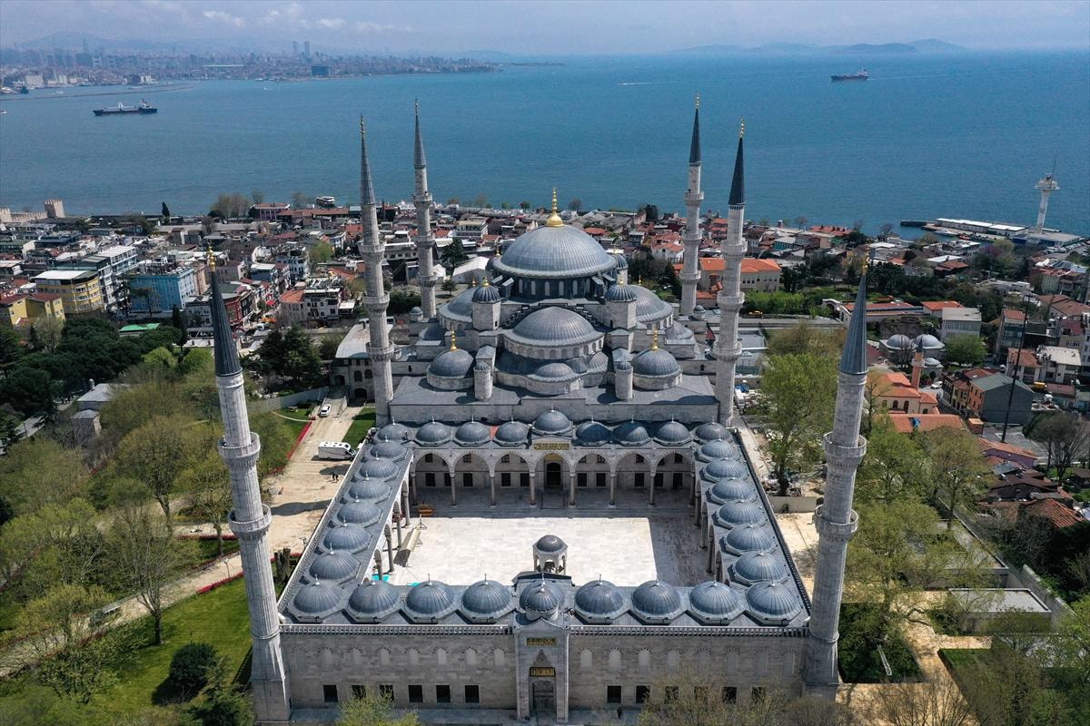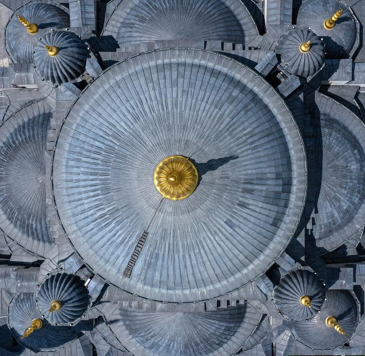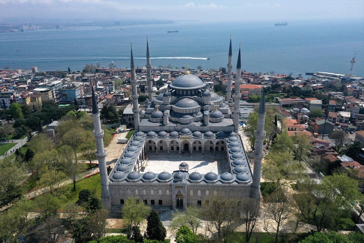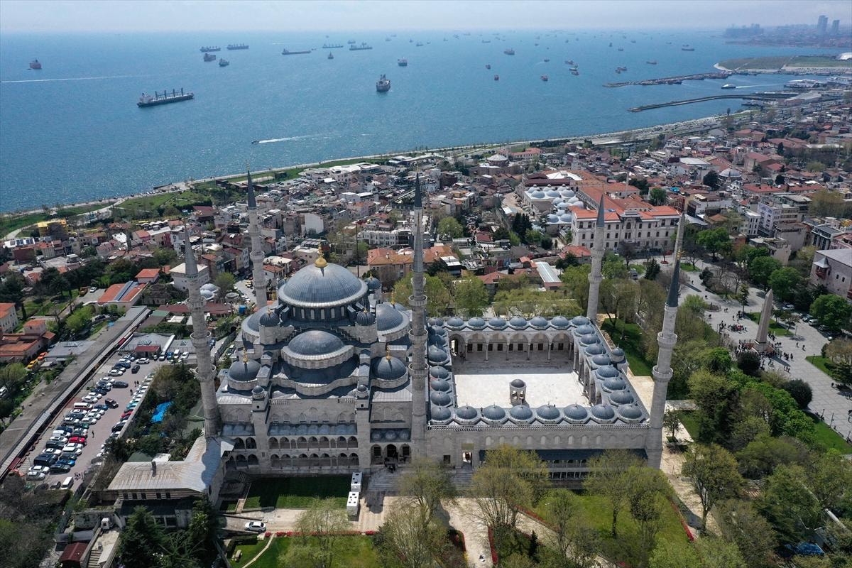 Ardından Sultanahmet Camii'nin kubbeleri ve minareleri ile avlusunun kaydedildiği görüntüler, 406 yıldır kentin kalbinde adeta bir mühür gibi duran caminin görkemini ortaya koyuyor.