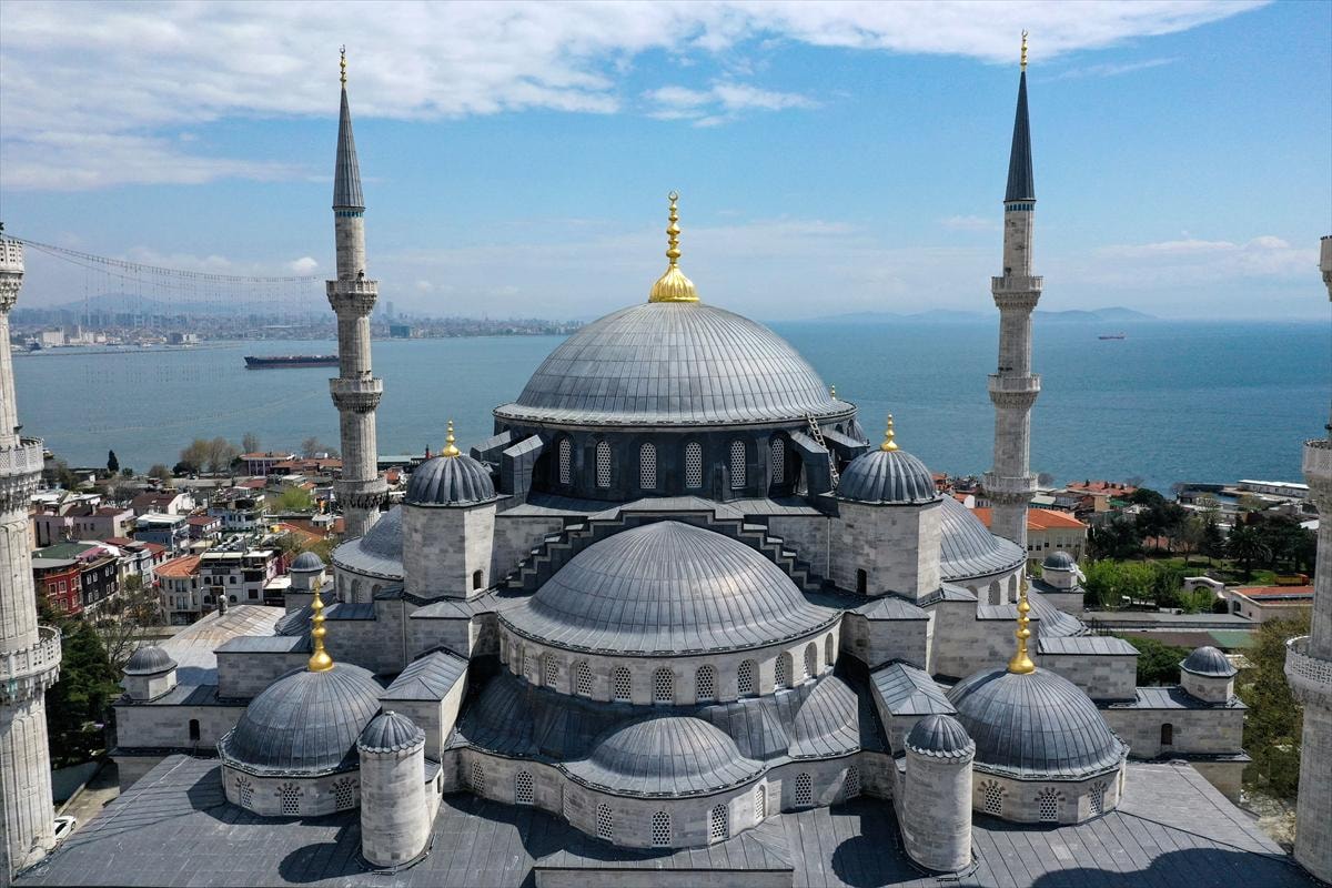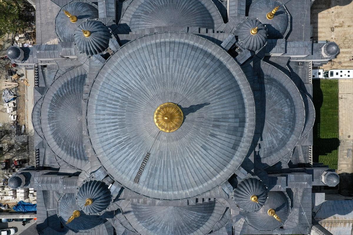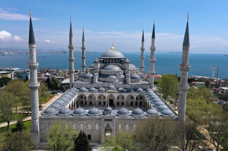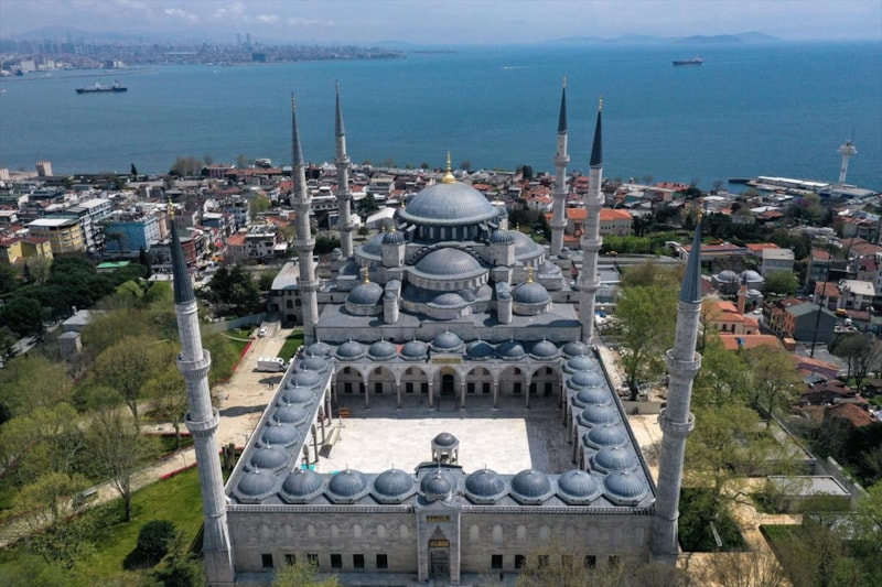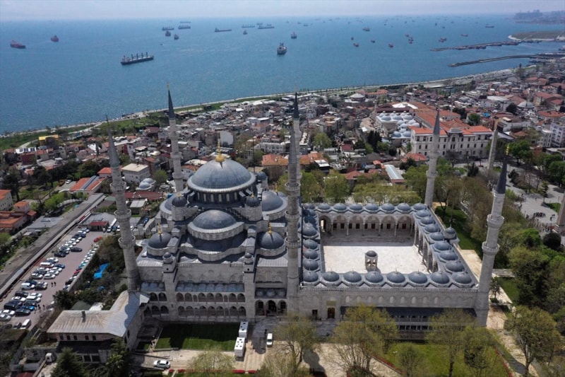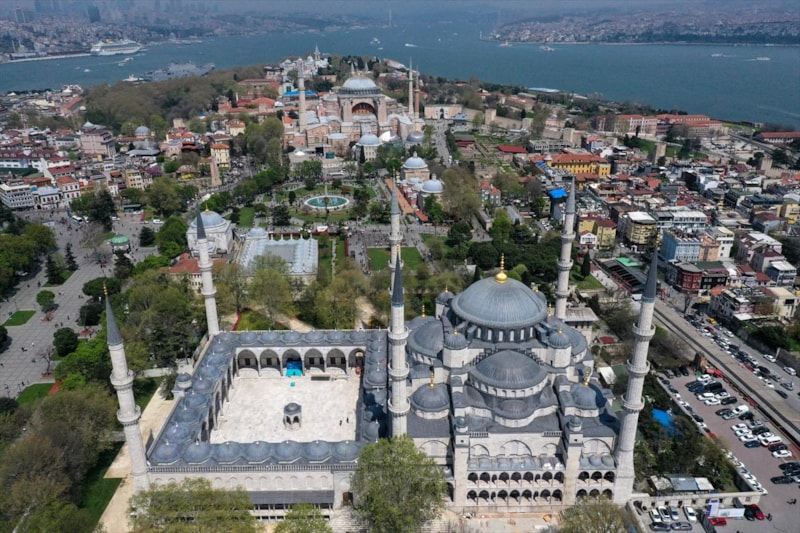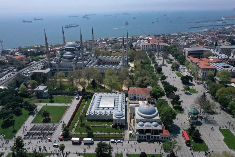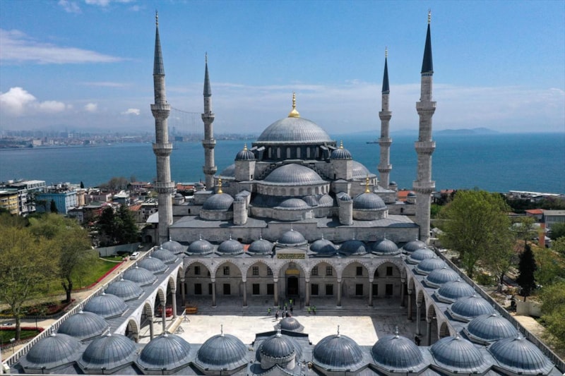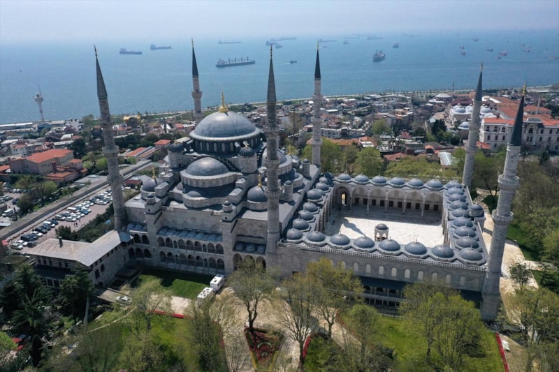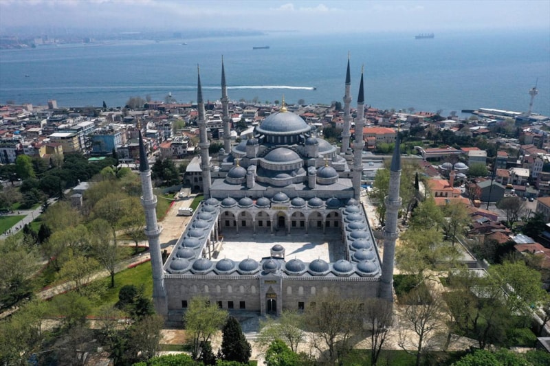 Ardından Sultanahmet Camii'nin kubbeleri ve minareleri ile avlusunun kaydedildiği görüntüler, 406 yıldır kentin kalbinde adeta bir mühür gibi duran caminin görkemini ortaya koyuyor.