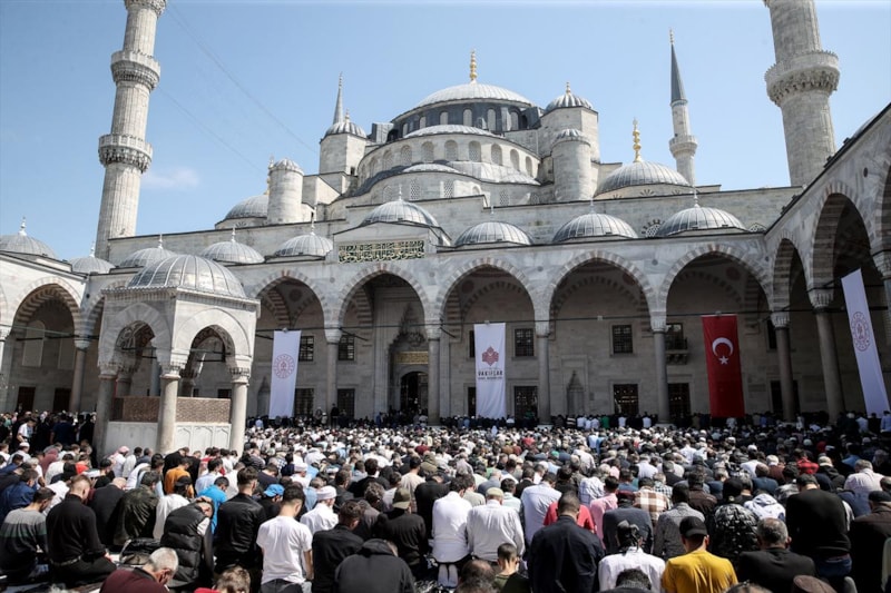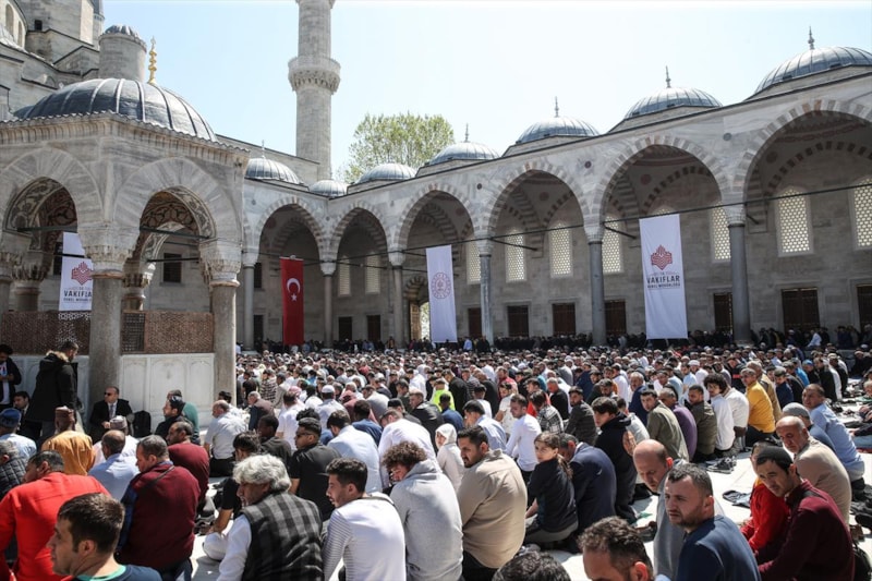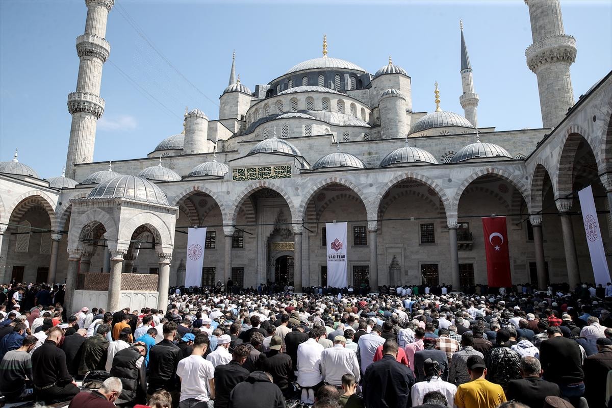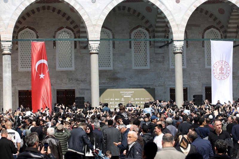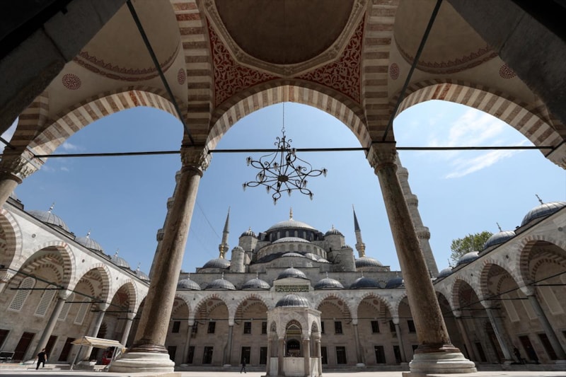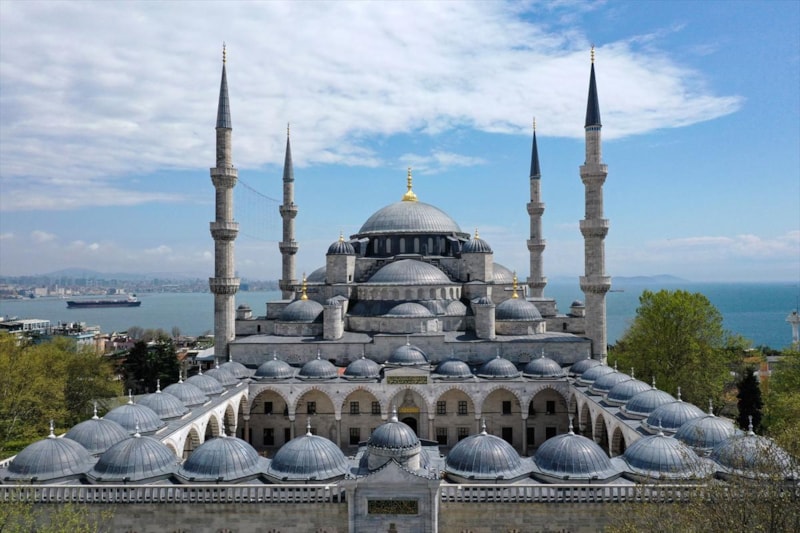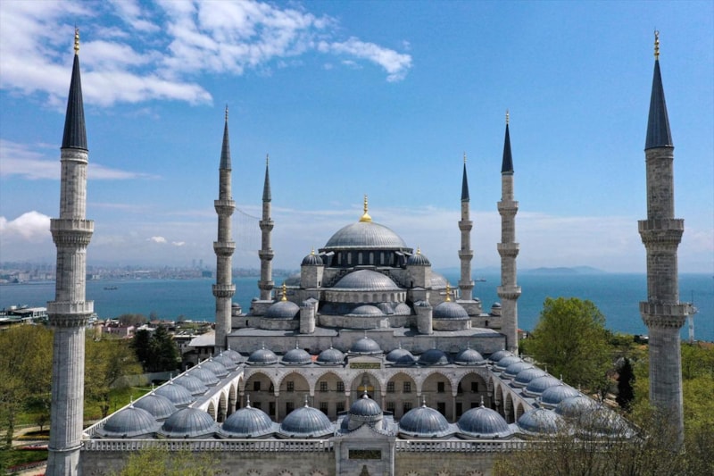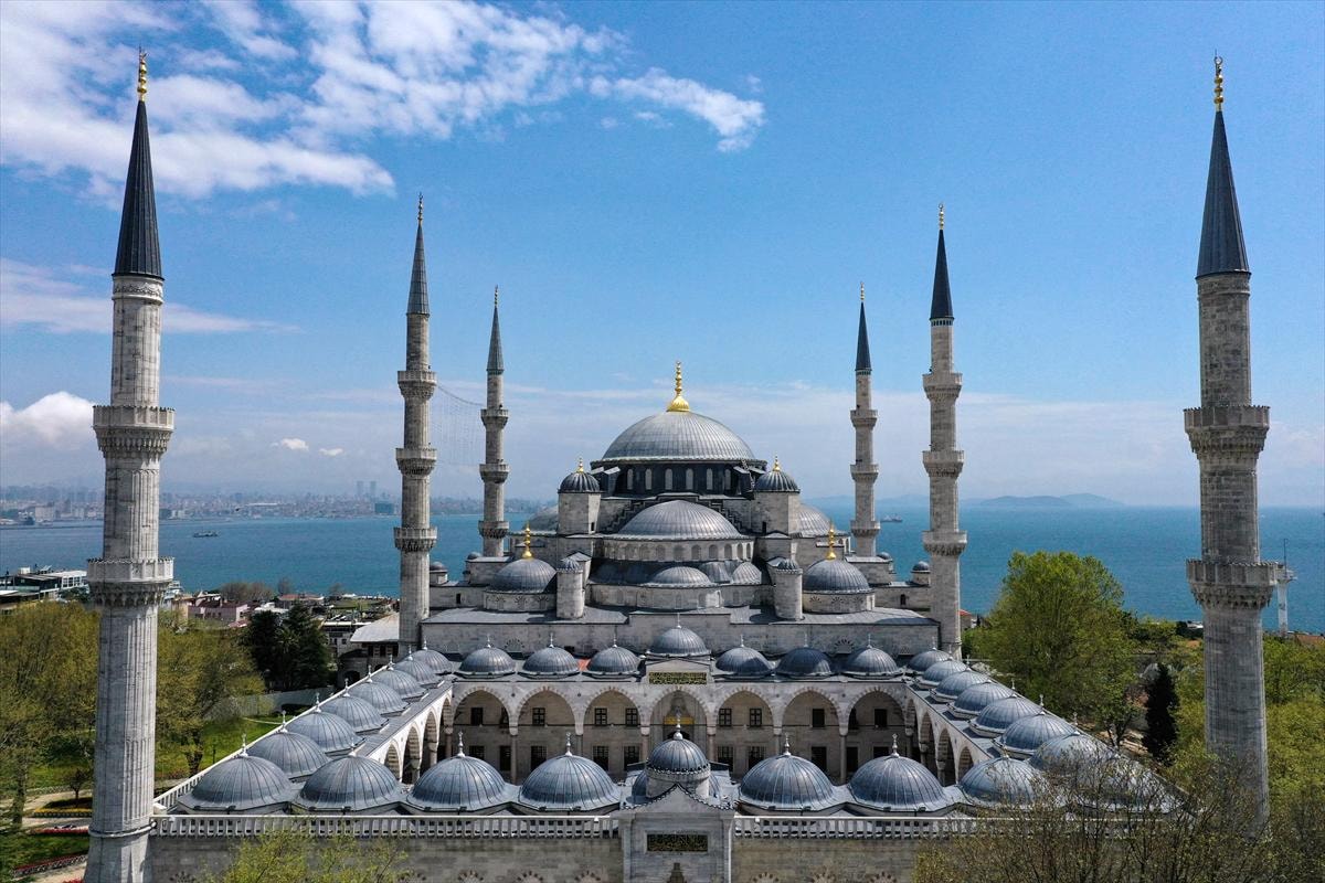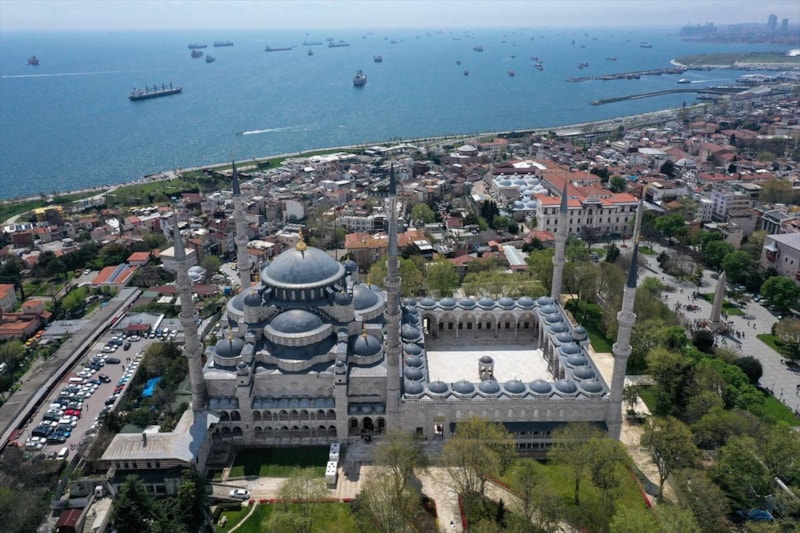 Ardından Sultanahmet Camii'nin kubbeleri ve minareleri ile avlusunun kaydedildiği görüntüler, 406 yıldır kentin kalbinde adeta bir mühür gibi duran caminin görkemini ortaya koyuyor.