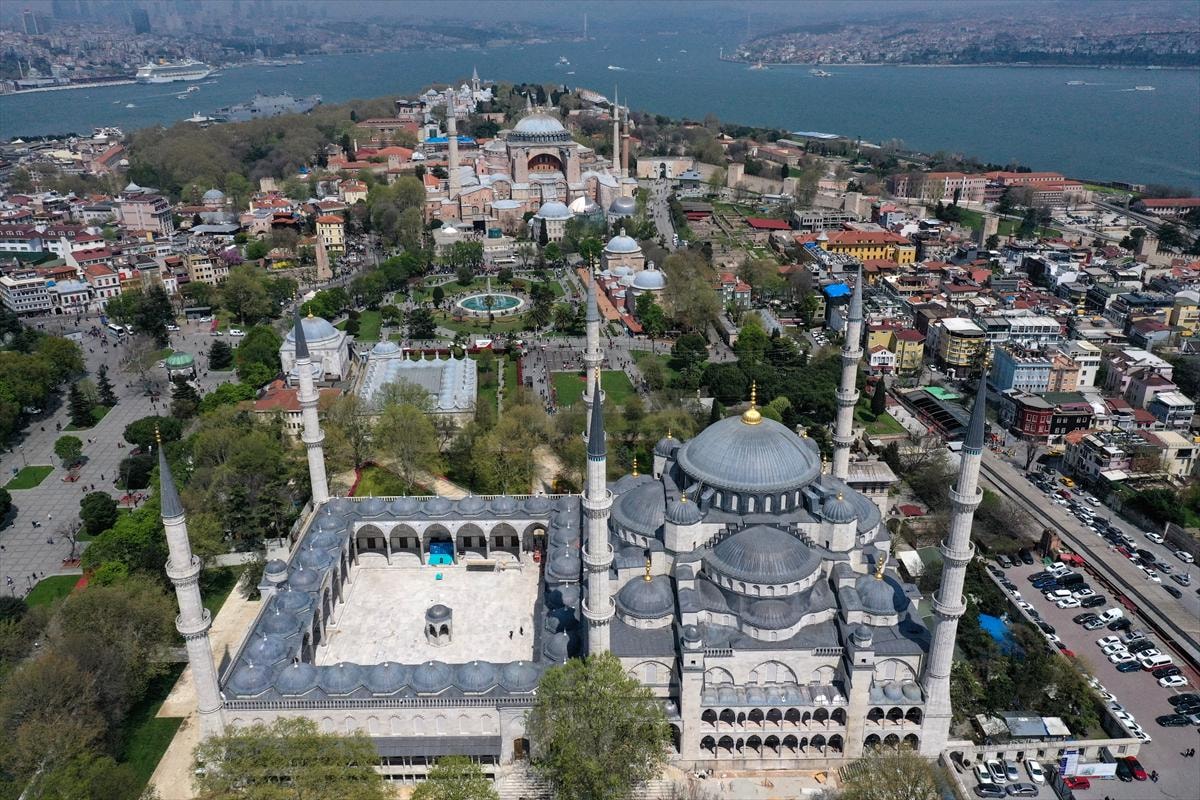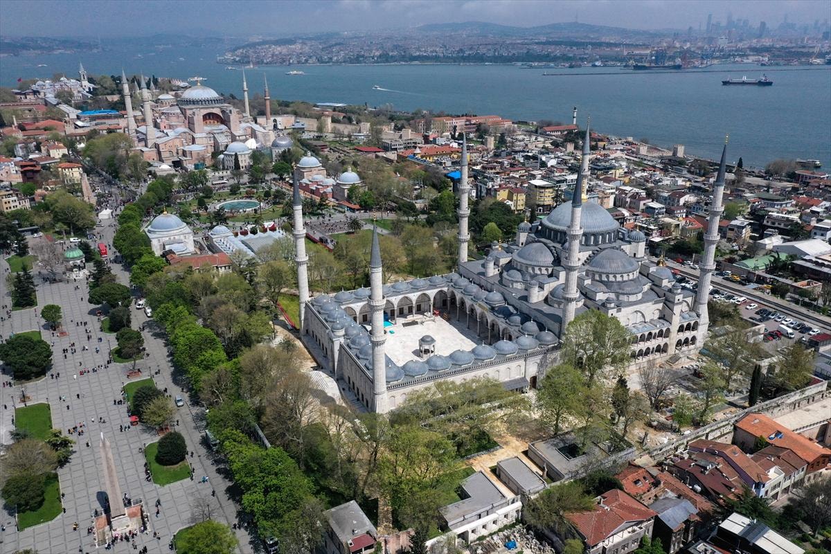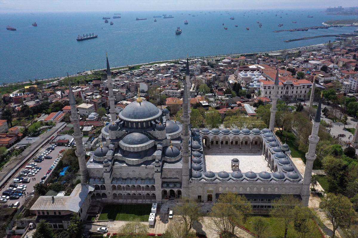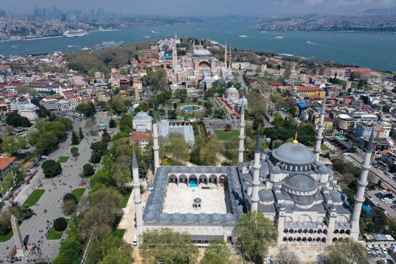 İstanbul'un Tarihi Yarımada'sını ihtişamıyla süsleyen Sultanahmet Camii ile Ayasofya-i Kebir Camii'nin birlikte yer aldığı görüntüler, kentin tarihi dokusunu da yansıtıyor.