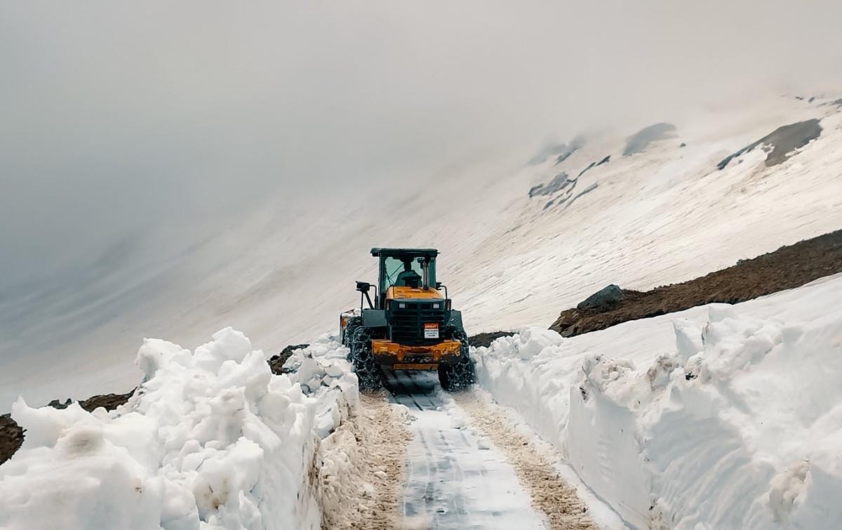 Engebeli yollardaki zor çalışma koşullarına rağmen gerçekleştirilen çalışma sonrasında Tahpur Yaylası'nın yolları temizleniyor.
