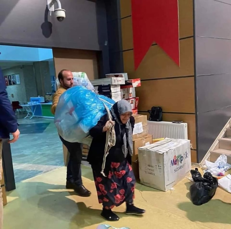 Kahramanmaraş merkezli 7.7'lik depremde etkilenen vatandaşlar için Karadeniz'de yardımlar toplanırken, Rize'de yaşlı bir teyzenin bir yardım çuvalını taşıması duygulandırdı.