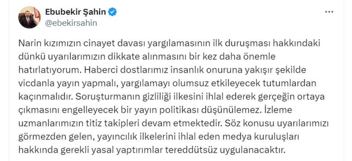 Diğer yandan, RTÜK Başkanı Şahin, Diyarbakır'daki Narin Güran cinayeti davasına ilişkin de medya mensuplarına uyarıda bulunarak şu ifadeleri kullandı: