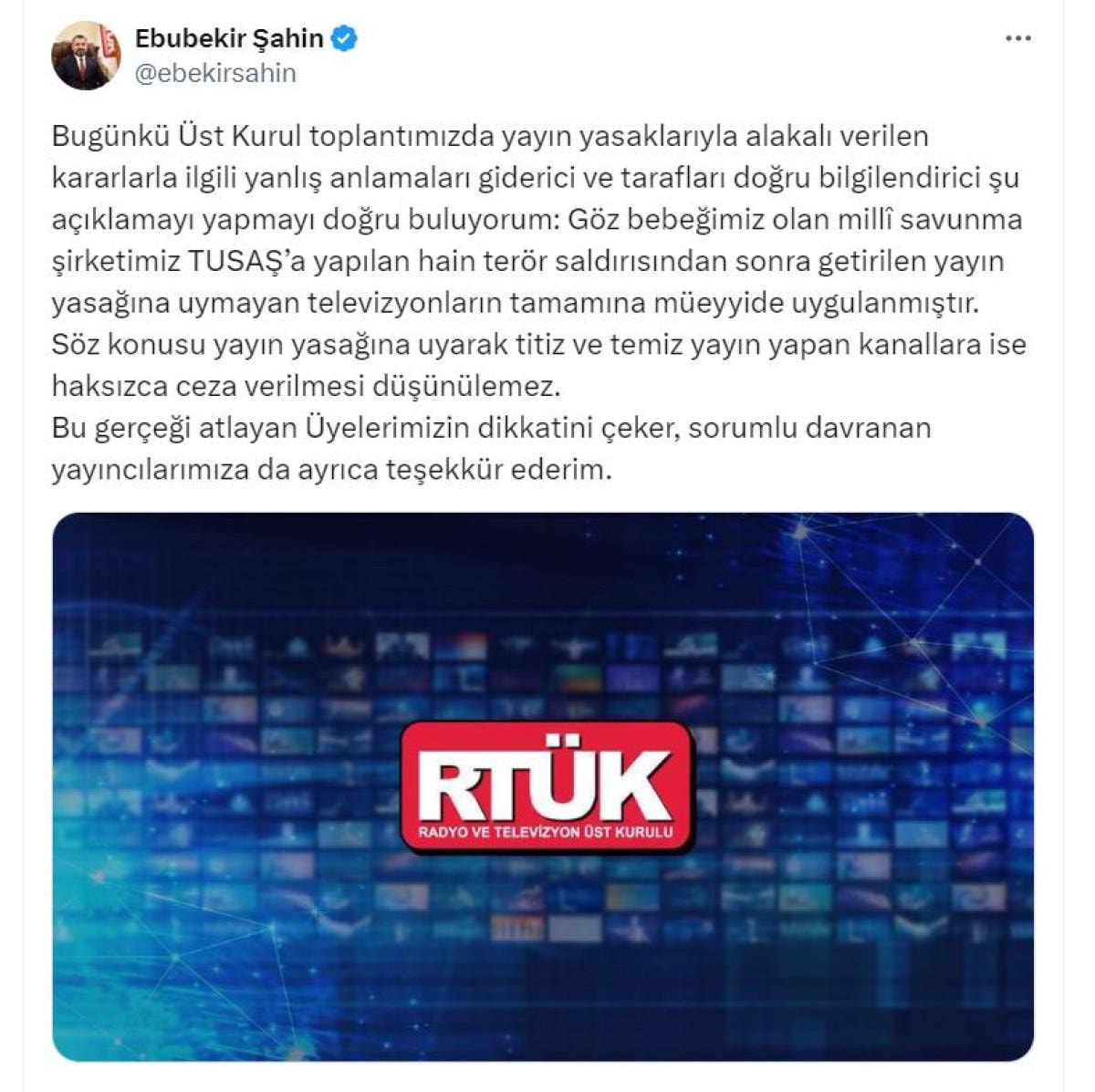 Bugünkü Üst Kurul toplantımızda yayın yasaklarıyla alakalı verilen kararlarla ilgili yanlış anlamaları giderici ve tarafları doğru bilgilendirici şu açıklamayı yapmayı doğru buluyorum: Göz bebeğimiz olan milli savunma şirketimiz TUSAŞ'a yapılan hain terör saldırısından sonra getirilen yayın yasağına uymayan televizyonların tamamına müeyyide uygulanmıştır. Söz konusu yayın yasağına uyarak titiz ve temiz yayın yapan kanallara ise haksızca ceza verilmesi düşünülemez. Bu gerçeği atlayan Üyelerimizin dikkatini çeker, sorumlu davranan yayıncılarımıza da ayrıca teşekkür ederim.