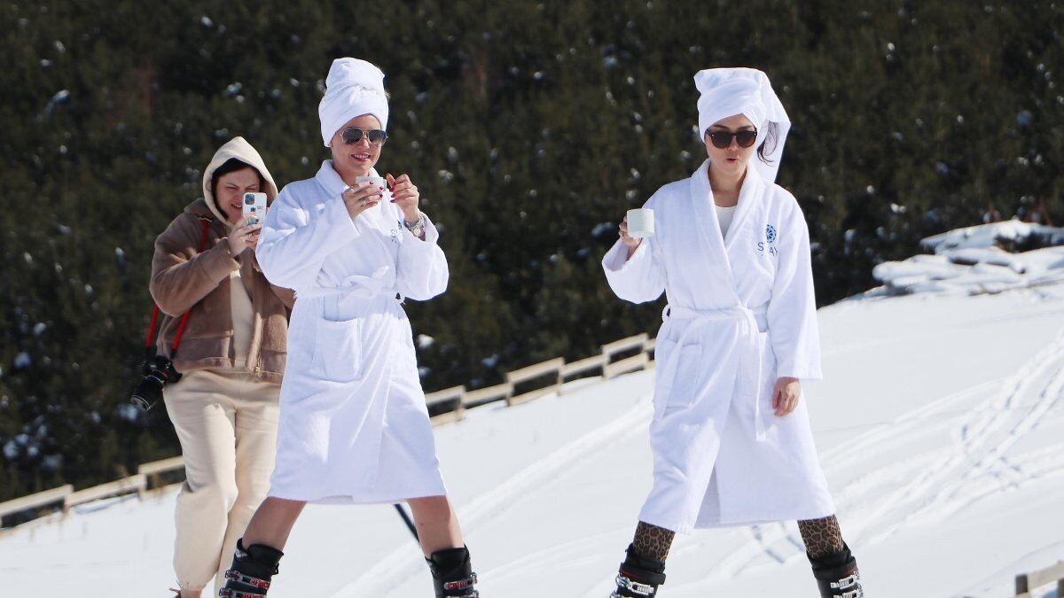 Rusya'dan gelerek Palandöken'de konaklayan Lubov Lubacka ile İrina Bespalova, tatilcilerin meraklı bakışları arasında, ellerinde fincan ve üzerlerinde bornoz ile kayak yaptı.
