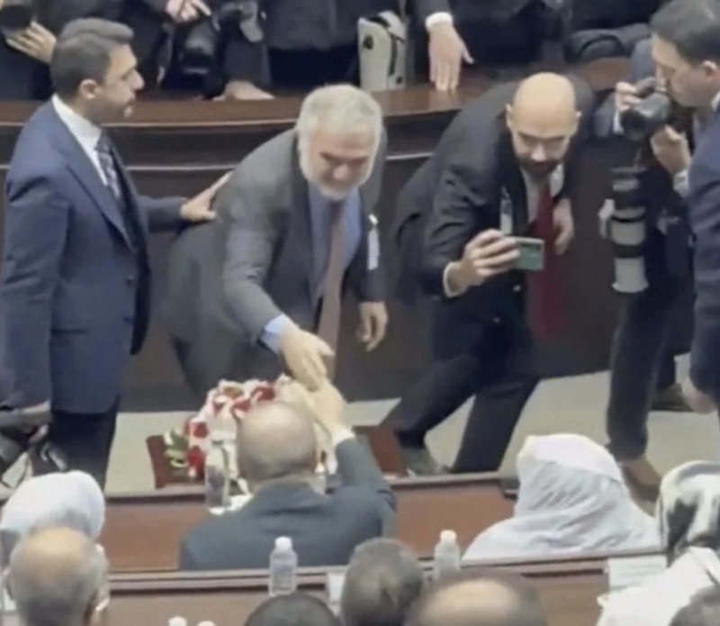 Ruşen Çakır'ın Cumhurbaşkanı Erdoğan'la tokalaştığı anlar, grup toplantısının en dikkati çeken karelerinden oldu.