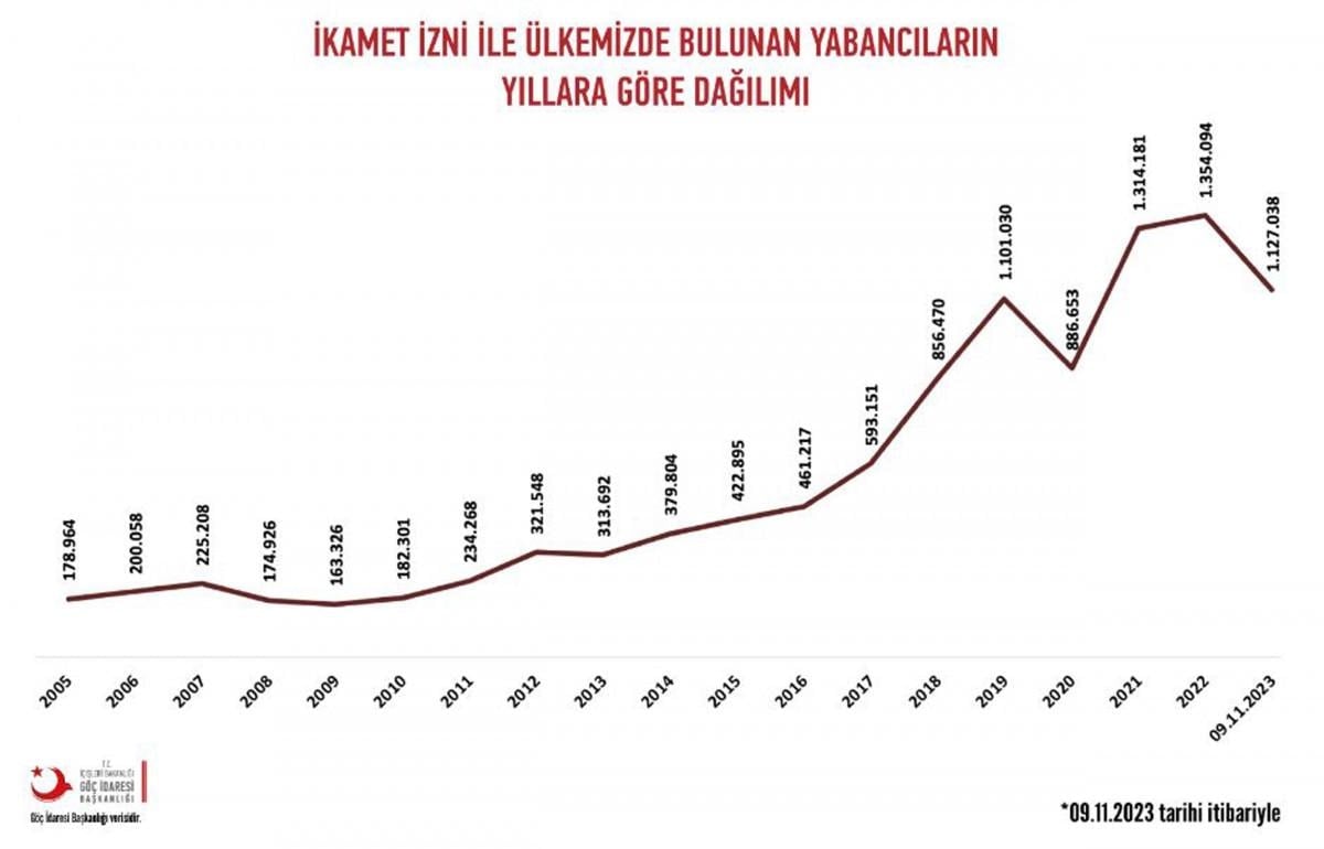 Türkiye'de ikamet izni ile bulunan yabancı sayısı, 2005 yılında 178 bin 964'ten 2015 yılında 422 bin 895'e ulaştı. 2018 yılında 856 bin 470'e yükselen ikamet izni ile Türkiye'de bulunan yabancı sayısı, 2019 yılında ilk kez 1 milyonu aşıp 1 milyon 101 bin 30 oldu. Bu sayı 2020'de 886 bin 653, 2021'de 1 milyon 314 bin 181, 2022'de 1 milyon 354 bin 94 olarak kayıtlara geçti.