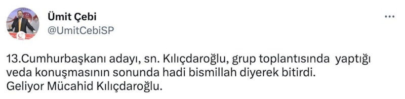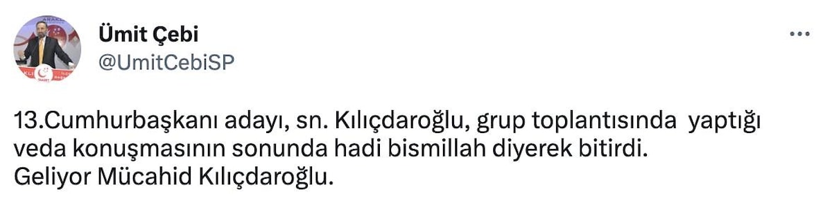 13.Cumhurbaşkanı adayı, sn. Kılıçdaroğlu, grup toplantısında yaptığı veda konuşmasının sonunda hadi bismillah diyerek bitirdi.