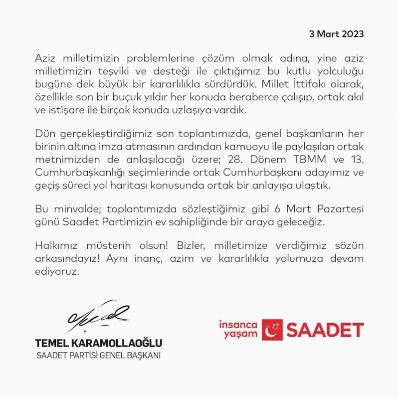 Aziz milletimizin problemlerine çözüm olmak adına, yine aziz milletimizin teşviki ve desteği ile çıktığımız bu kutlu yolculuğu bugüne dek büyük bir kararlılıkla sürdürdük. Millet ittifakı olarak, özellikle son bir buçuk yıldır her konuda beraberce çalışıp, ortak akıl ve istişare ile birçok konuda uzlaşıya vardık. Dün gerçekleştirdiğimiz son toplantımızda, genel başkanların her birinin altına imza atmasının ardından kamuoyu ile paylaşılan ortak metnimizden de anlaşılacağı üzere; 28. Dönem TBMM ve 13. Cumhurbaşkanlığı seçimlerinde ortak Cumhurbaşkanı adayımız ve geçiş süreci yol haritası konusunda ortak bir anlayışa ulaştık. Bu minvalde; toplantımızda sözleştiğimiz gibi 6 Mart Pazartesi günü Saadet Partimizin ev sahipliğinde bir araya geleceğiz. Halkımız müsterih olsun! Bizler, milletimize verdiğimiz sözün arkasındayız! Aynı inanç, azim ve kararlılıkla yolumuza devam ediyoruz.