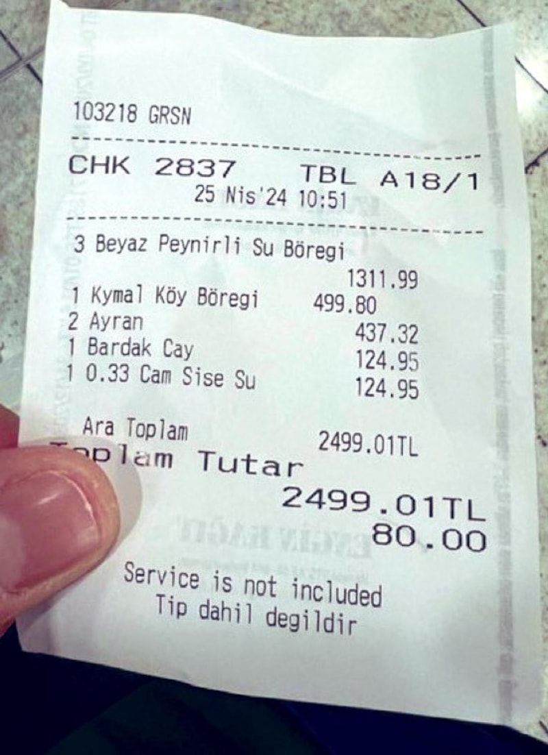 3 beyaz peynirli su böreği yemek için bin 311 TL ödendi. Yani bir dilimi 437 lira.
