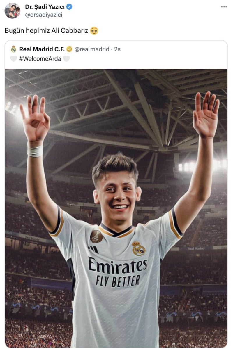 Tuzla Belediye Başkanı Dr. Şadi Yazıcı, Real Madrid'e transfer olan Fenerbahçe'nin genç yıldızı Arda Güler'in fotoğrafını "Bugün hepimiz Ali Cabbarız" notuyla paylaştı.