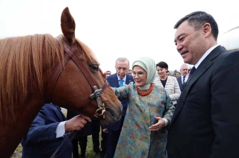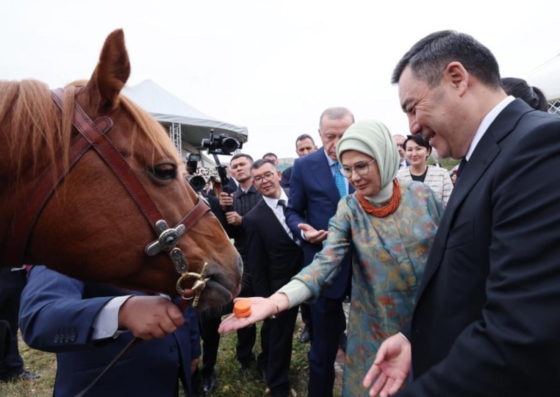 Kırgızistan Cumhurbaşkanı Sadır Caparov, Cumhurbaşkanı Erdoğan'a at hediye ederken, Cumhurbaşkanı ve eşi atı elleriyle besledi.