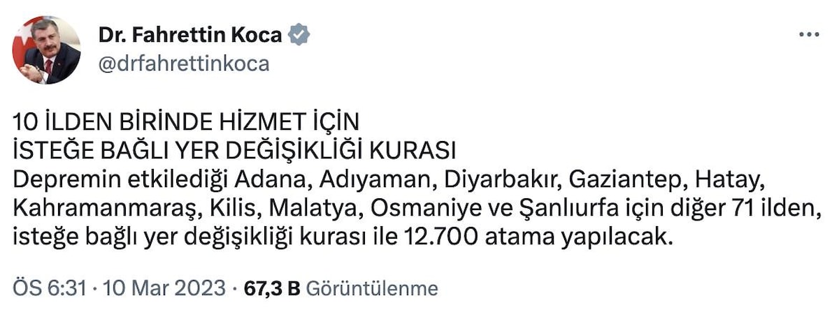 Fahrettin Koca, Adana, Adıyaman, Diyarbakır, Gaziantep, Hatay, Maraş, Kilis, Malatya, Osmaniye, Şanlıurfa için 71 ilden isteğe bağlı yer değişikliği kurası ile 12 bin 700 atama yapılacağını söyledi.