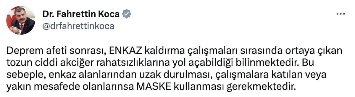 Sosyal medya hesabından açıklama yapan Sağlık Bakanı Fahrettin Koca, deprem bölgesinde maske takılmasının önemine bir kez daha değindi.