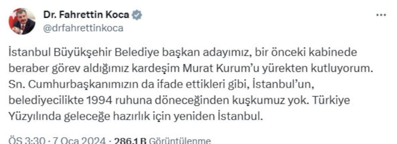 Sağlık Bakanı Fahrettin Koca "İstanbul Büyükşehir Belediye başkan adayımız, bir önceki kabinede beraber görev aldığımız kardeşim Murat Kurum’u yürekten kutluyorum" dedi.