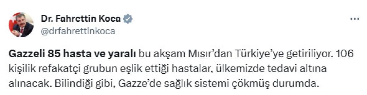 Sağlık Bakanı Fahrettin Koca, sosyal medya hesabından Gazze'den Mısır'a getirilen hastalara ilişkin paylaşımda bulundu.
