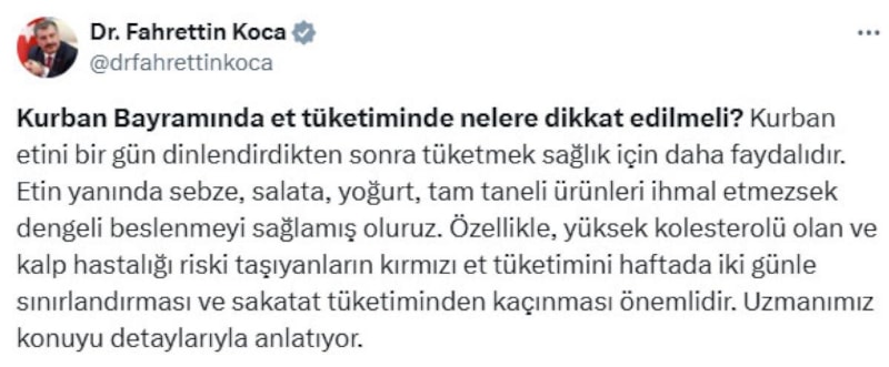 Kurban Bayramı'nda et tüketimi sağlık açısından oldukça önemli.. Bayramda yeni kesilen etin nasıl tüketilmesi gerektiğine dair Sağlık Bakanı Fahrettin Koca'dan bir paylaşım geldi.