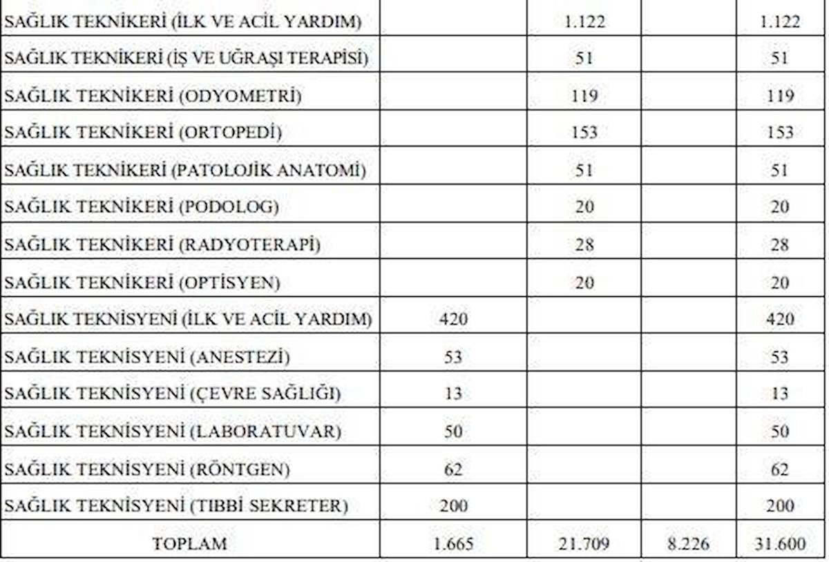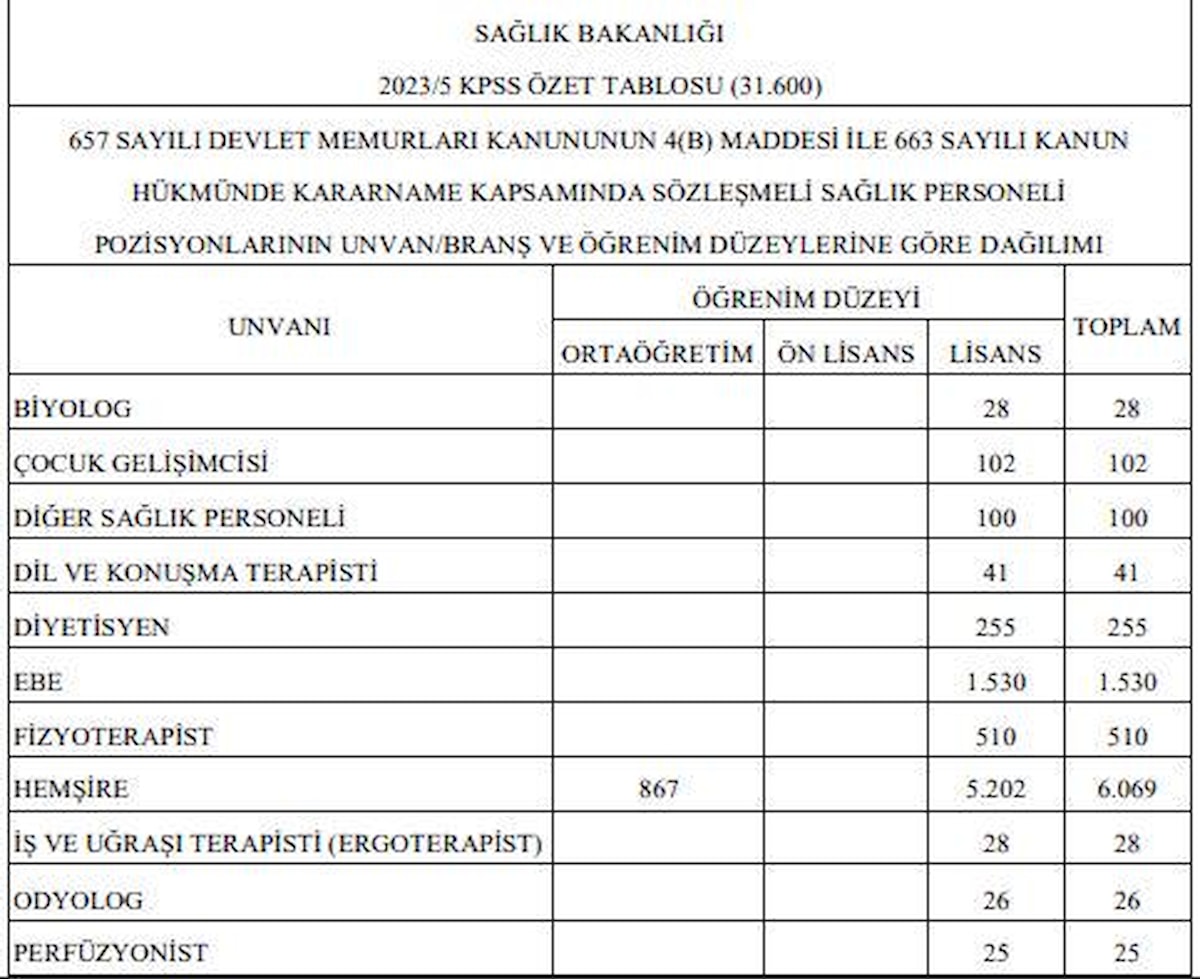 Bakanlığımızın taşra teşkilatı hizmet birimlerinde istihdam edilmek üzere, KPSS sonucuna göre ÖSYM tarafından yapılacak merkezi yerleştirme ile 31.600 sözleşmeli sağlık personeli alınacak.