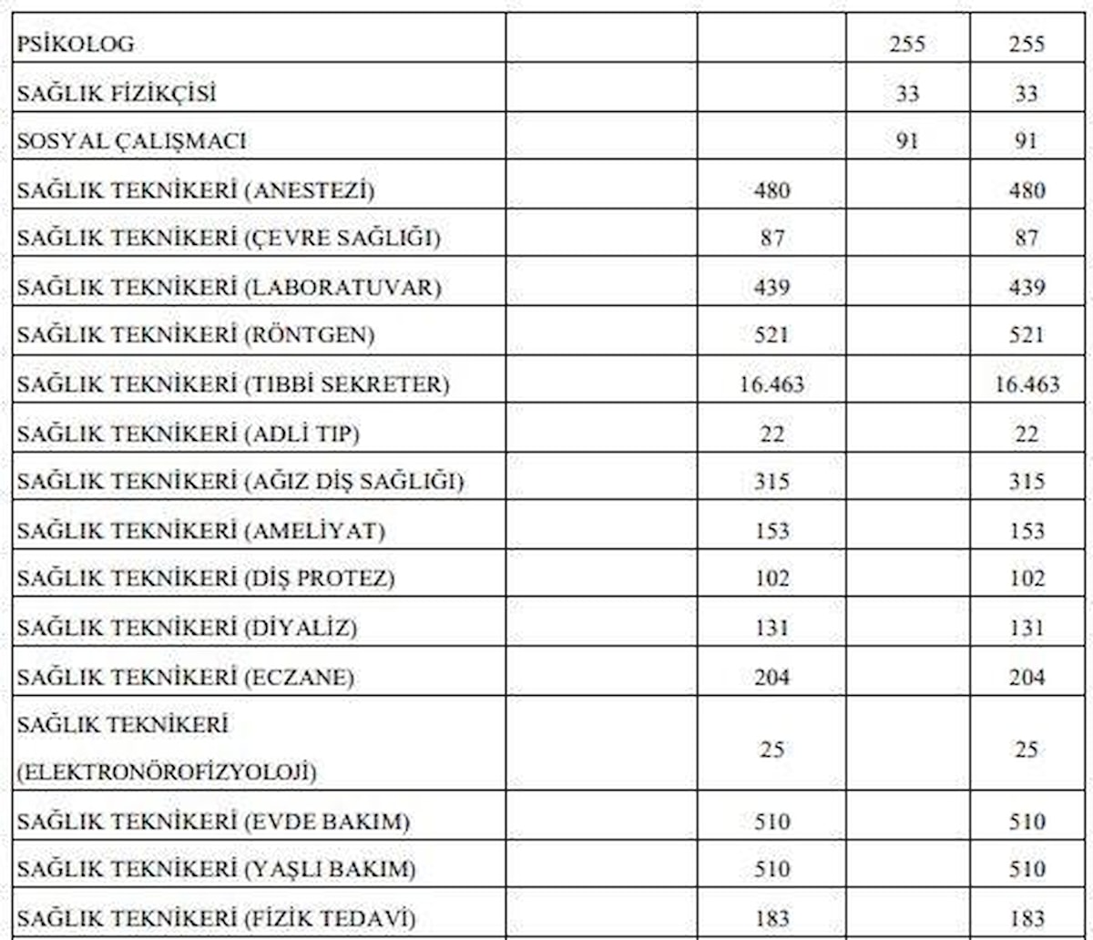 Deprem bölgesinde olan 10 il için 3.358 Hemşire, 1.027 Ebe, 400 Sağlık Lisansiyeri, 507 Sağlık Teknisyeni ve 3.767 Sağlık Teknikeri olmak üzere 9.059 Sözleşmeli Sağlık Personeli ve 2.832 Sürekli İşçi, toplamda 11.891 personel istihdam edilecektir.