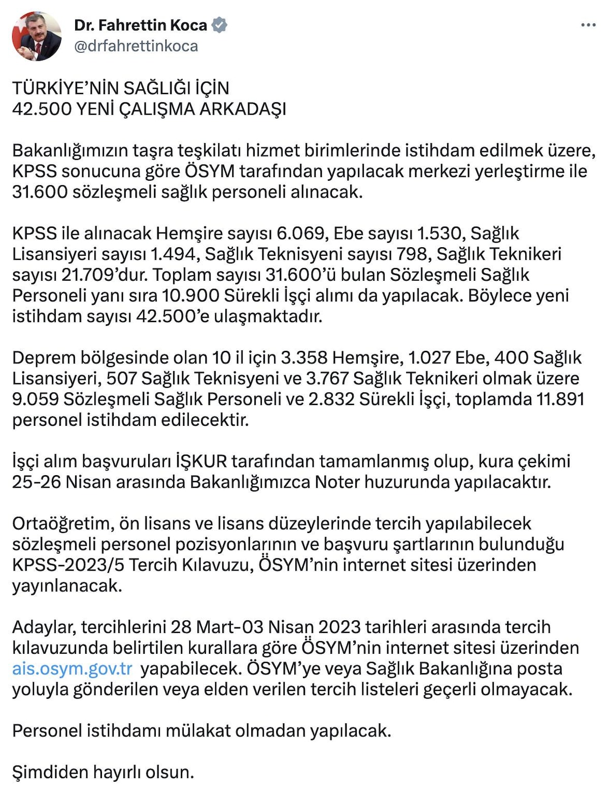 Bakan Koca sosyal medya hesabında yaptığı açıklamada, Türkiye'nin Sağlığı için mülakatsız alınacak 42.500 yeni sağlık personelinin detaylarını vererek şu ifadeleri kullandı;