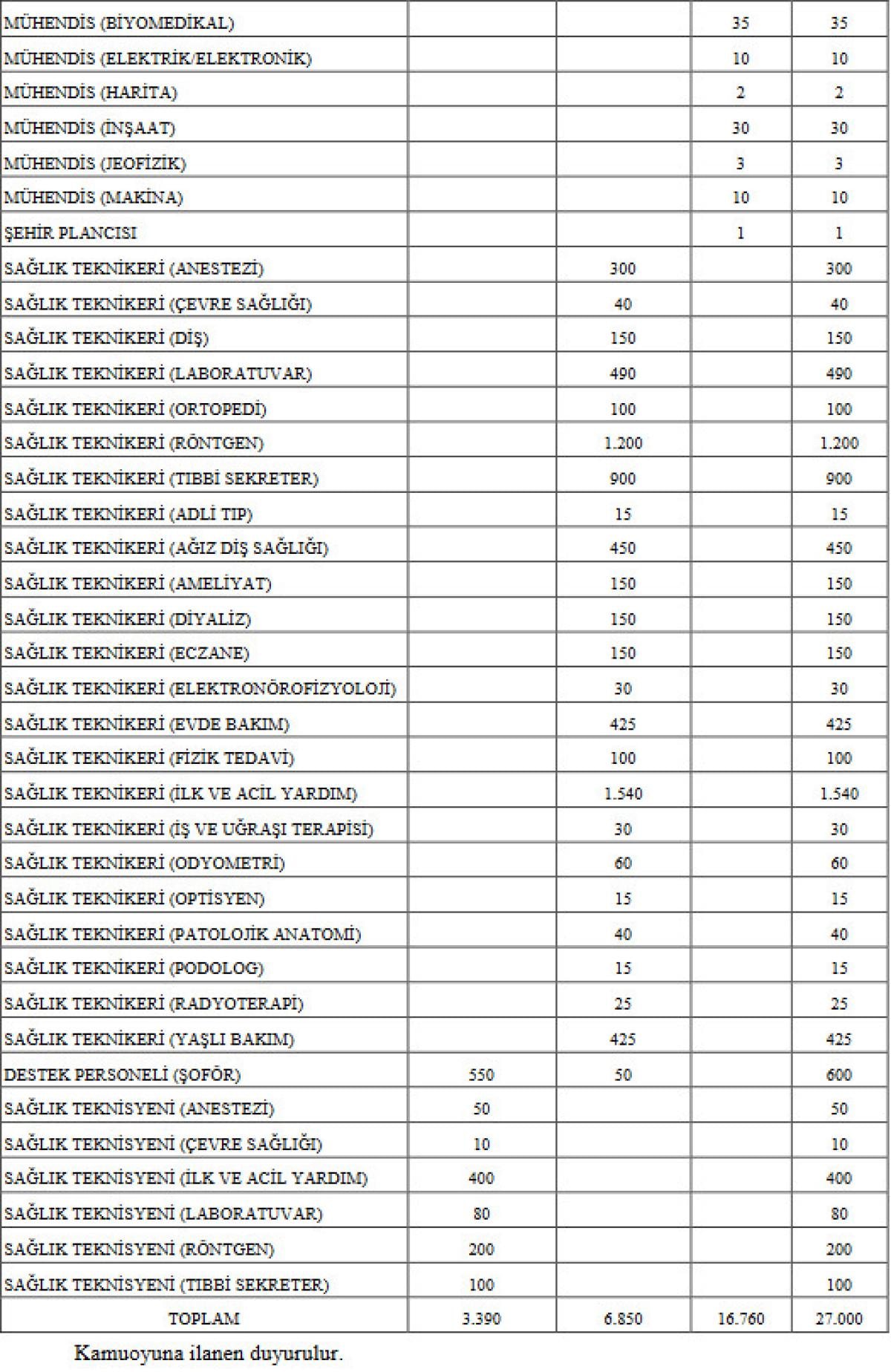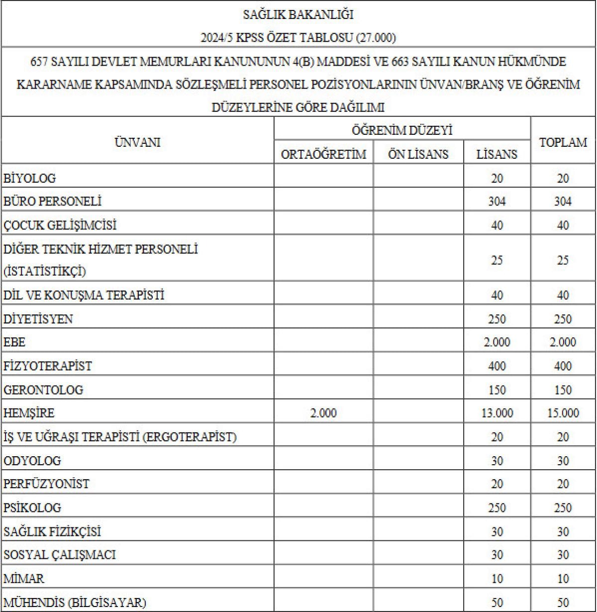 1. Sağlık Bakanlığı taşra teşkilatı hizmet birimlerinde istihdam edilmek üzere 657 sayılı Devlet Memurları Kanunun 4 üncü maddesinin (B) fıkrası ile 663 sayılı Kanun Hükmünde Kararnamenin 45/A maddesi kapsamında 27 bin sözleşmeli personel Kamu Personel Seçme Sınavı (KPSS) sonucuna göre ÖSYM tarafından yapılacak merkezi yerleştirme ile alınacaktır.