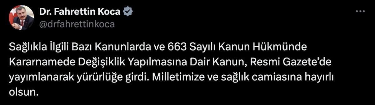 Sağlık Bakanı Fahrettin Koca, kanunun Resmi Gazete'de yayınlanmasının ardından sosyal medya hesabından şu paylaşımda bulundu: