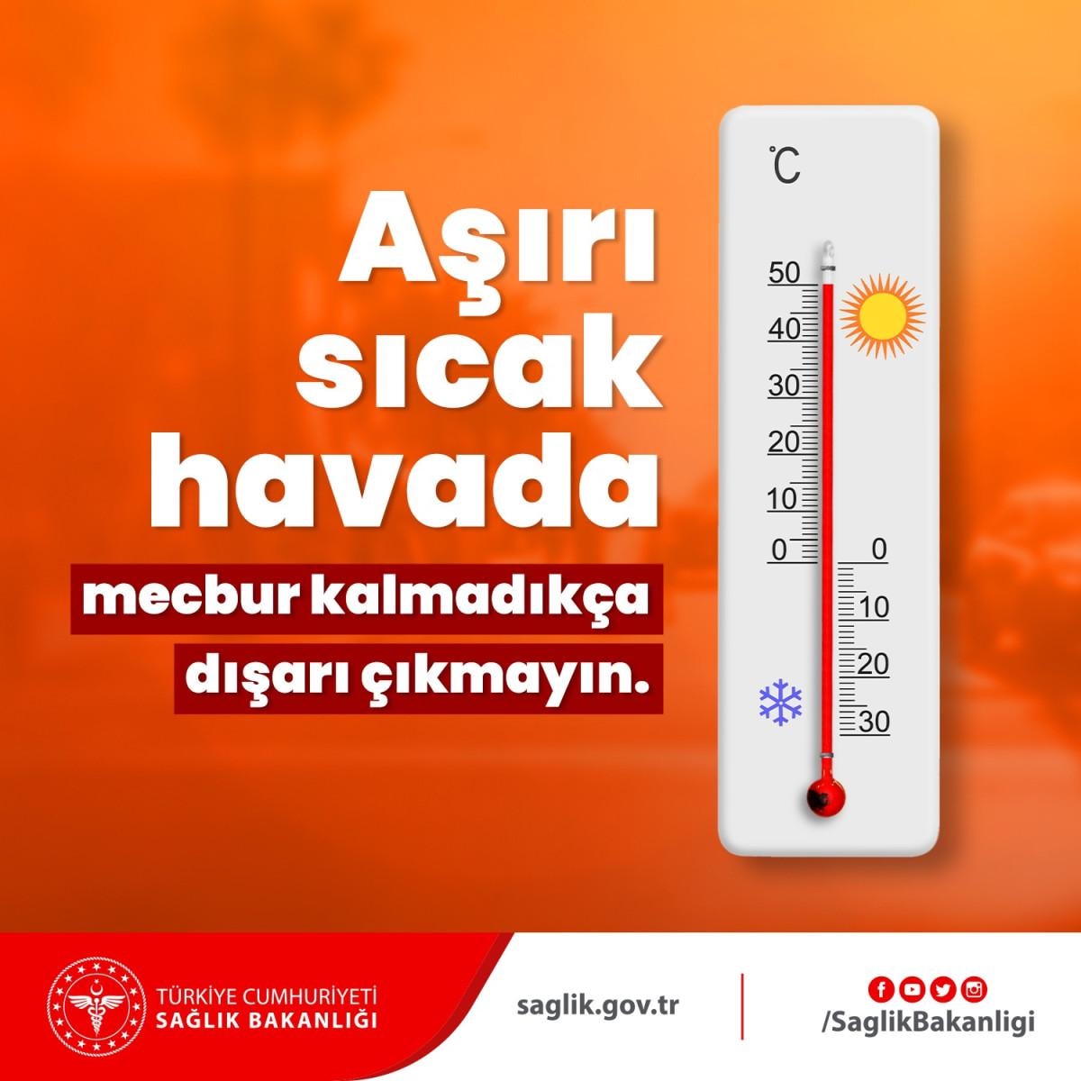 Bakanlığın Twitter hesabından hava sıcaklığının 50 dereceye ulaştığını gösteren 'Aşırı sıcak havada mecbur kalmadıkça dışarı çıkmayın' mesajı yazılı termometre fotoğrafı paylaşıldı.