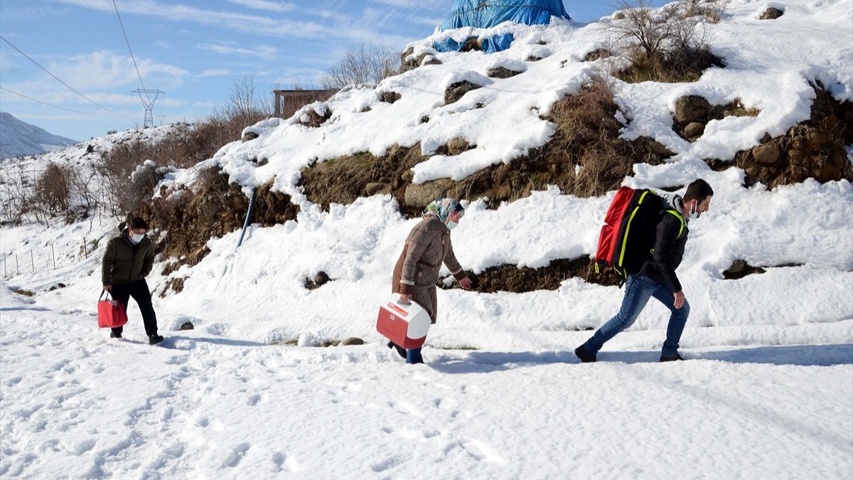 Bitlis'te de İl Sağlık Müdürlüğü'nce 30'u doktor 90 kişilik personelden oluşturulan ekip, karla kaplı yolları aşarak 85 yaş ve üstü kişileri koronavirüse karşı aşıladı.