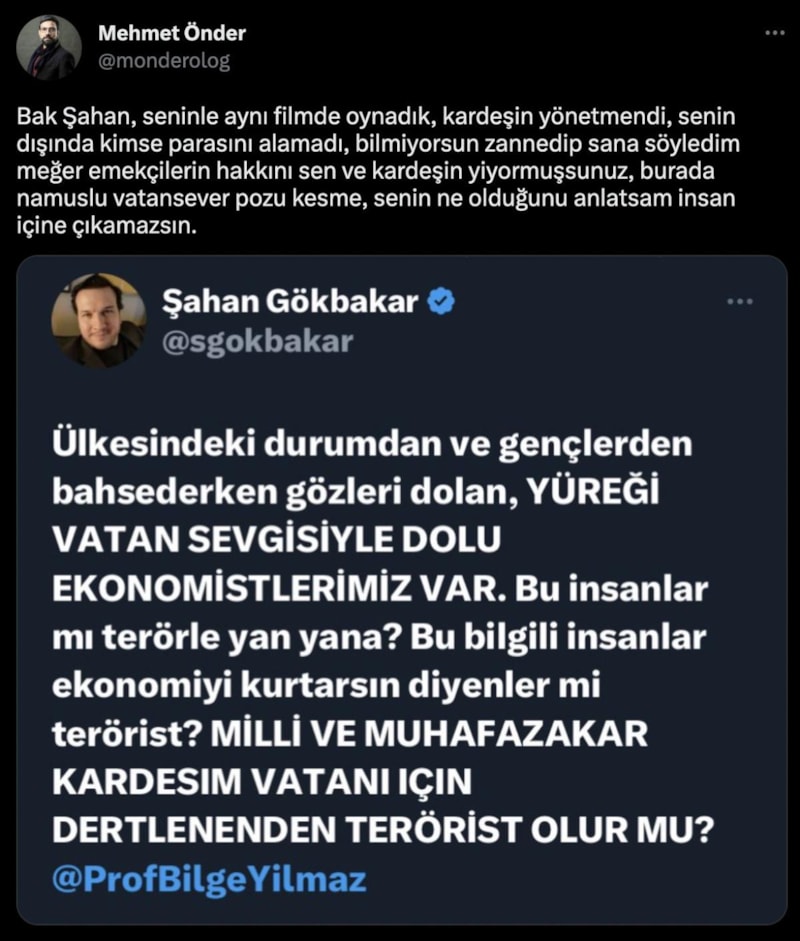 Şahan Gökbakar ile oynadığı bir filmden ücretini alamayan oyuncu-sunucu Mehmet Önder, projeden sadece Gökbakar'ın yönetmen olan kardeşi sayesinde ücretini alan tek isim olduğunu belirterek, "burada namuslu vatansever pozu kesme" diyerek tepki gösterdi.
