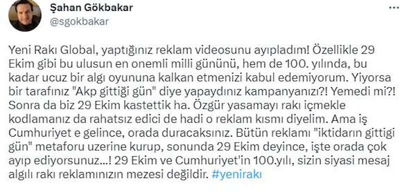 14 Mayıs'ta hükümetin seçimleri kaybetmesi sonrası kutlamaların rakı içilerek yapılacağını anlatan reklam filmi, Şahan Gökbakar'ı çileden çıkardı.