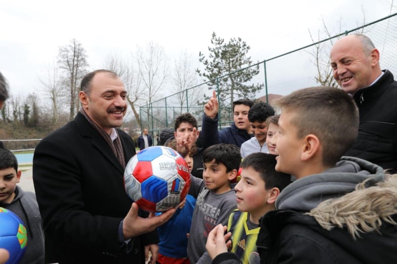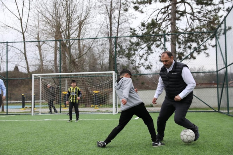 Vali Kaldırım, ziyaret sırasında muhtarlık binası yanındaki halı sahada çocukların futbol oynadığını gördü.