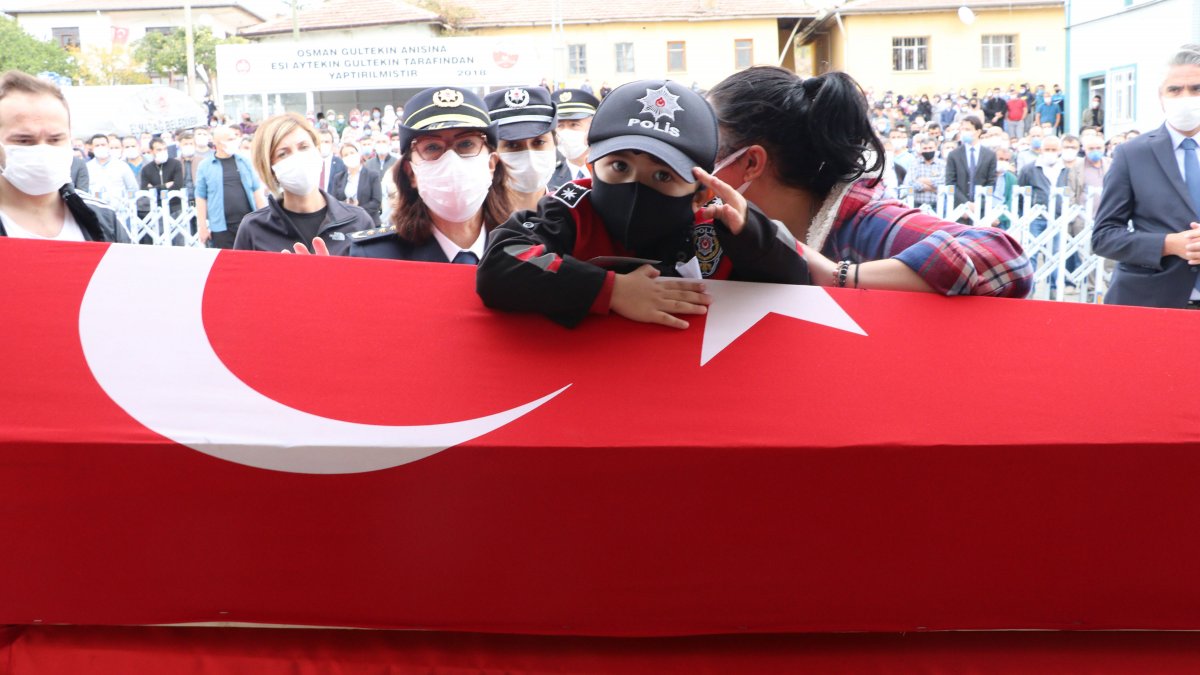 Şehidin oğlu Poyraz da, polis üniformasıyla törene katıldı. Babasının Türk bayrağına sarılı tabutunu öpen Poyraz, daha sonra annesine dönerek, 'Babam ne yapıyor bunun içinde' dedi.