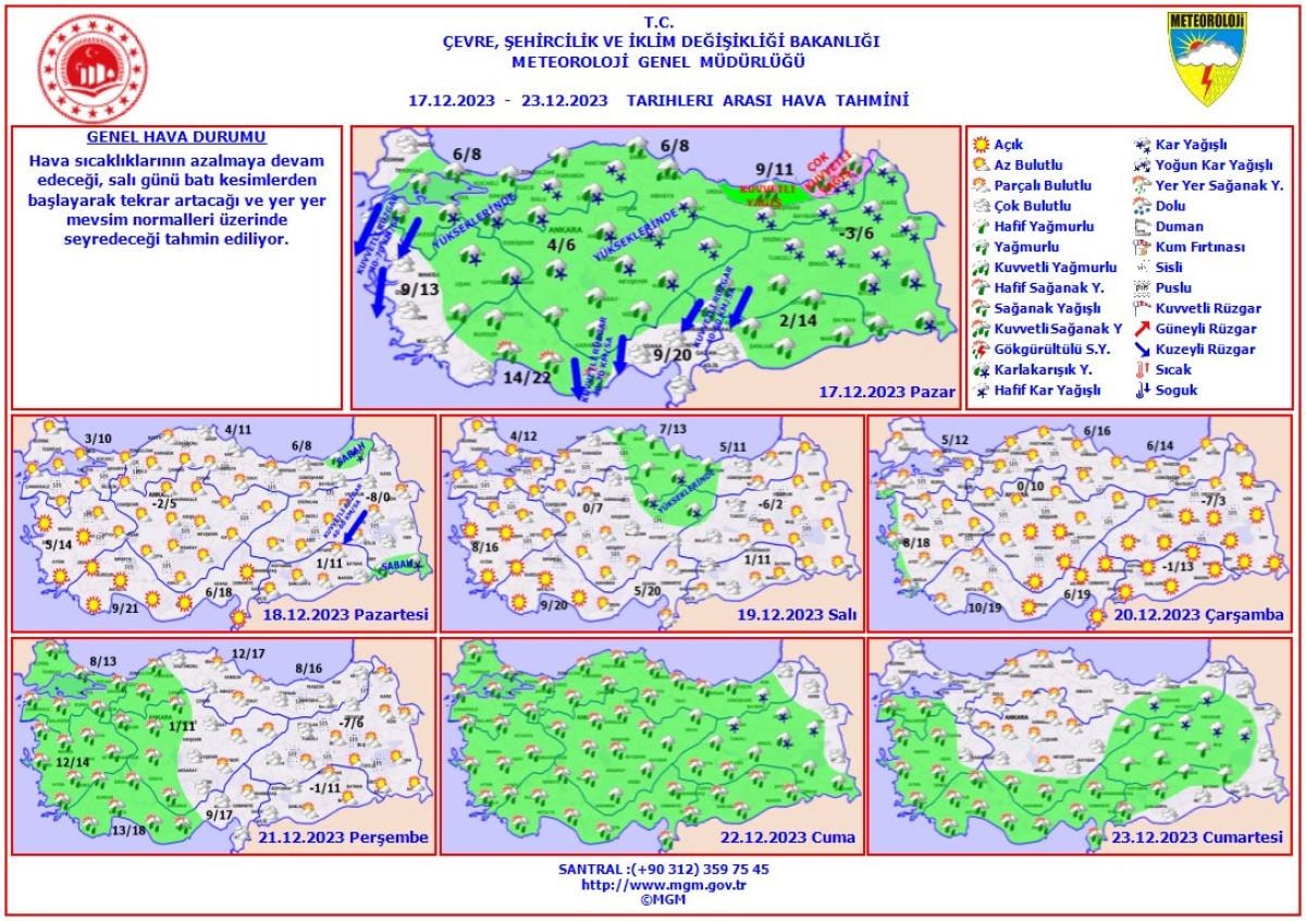 Pazar günü hava sıcaklıklarının azalmaya devam edeceği, salı günü batı kesimlerden başlayarak tekrar artacağı ve yer yer mevsim normalleri üzerinde seyredeceği belirtildi.