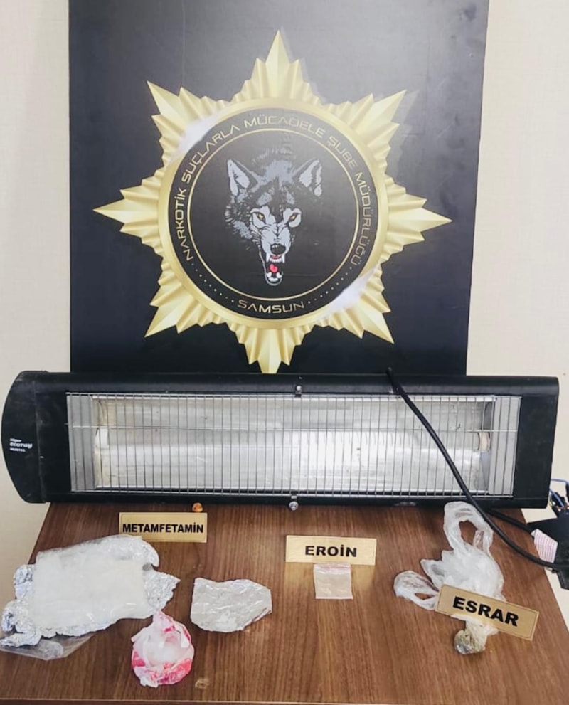 Araçta yapılan aramada elektrikli ısıtıcı içine gizlenmiş 3 paket halinde toplam 97,53 gram metamfetamin, 2,55 gram eroin ve 1,33 gram esrar ele geçirildi.