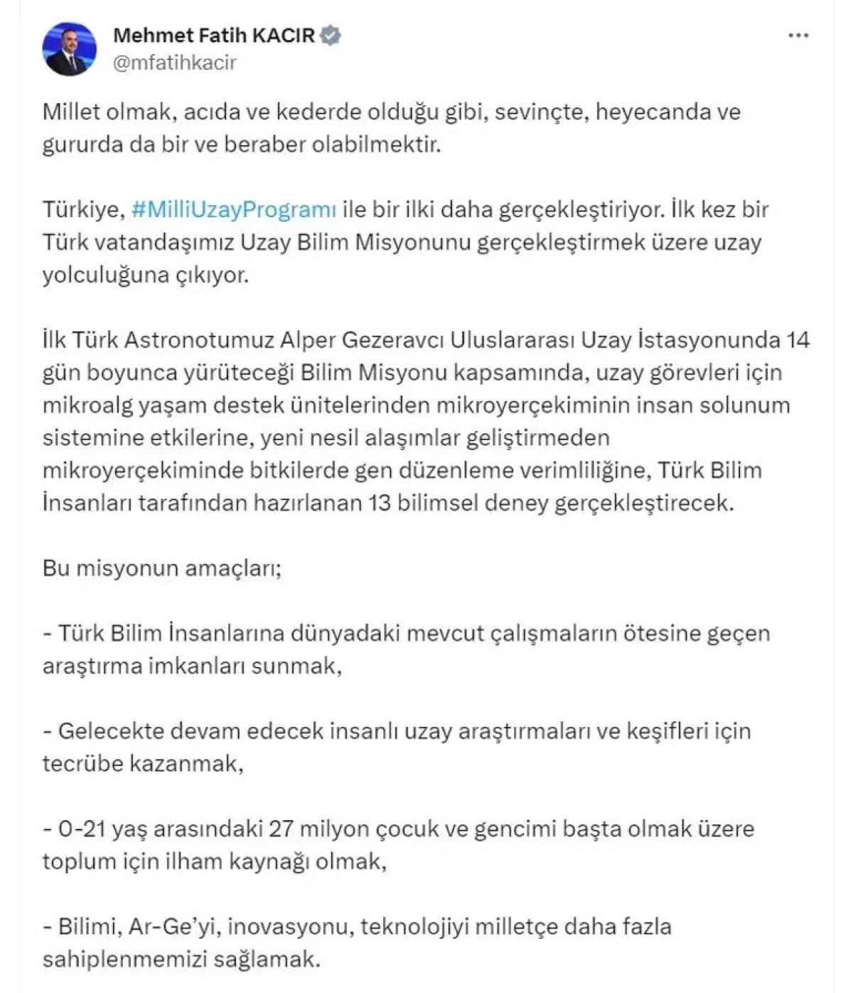 - Bilimi, Ar-Ge’yi, inovasyonu, teknolojiyi milletçe daha fazla sahiplenmemizi sağlamak. Bu misyonda astronotumuz yalnız olmayacak.