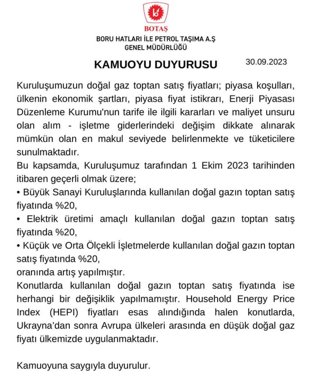 Kurumun internet sitesinde yer alan duyuruda, "Konutlarda kullanılan doğalgazın toptan satış fiyatında herhangi bir değişiklik yapılmamıştır. Household Energy Price Index (HEPI) fiyatları esas alındığında halen konutlarda, Ukrayna'dan sonra Avrupa ülkeleri arasında en düşük doğalgaz fiyatı ülkemizde uygulanmaktadır." ifadeleri kullanıldı.