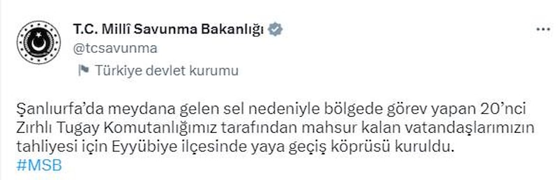 Şanlıurfa’da meydana gelen sel nedeniyle bölgede görev yapan 20’nci Zırhlı Tugay Komutanlığımız tarafından mahsur kalan vatandaşlarımızın tahliyesi için Eyyübiye ilçesinde yaya geçiş köprüsü kuruldu.