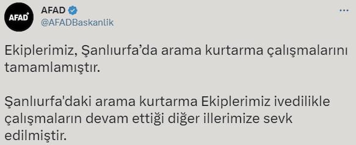 O illerden biri olan Şanlıurfa’da arama kurtarma çalışmaları tamamlandı. Kentteki ekipler de başka illere yönlendirildi.