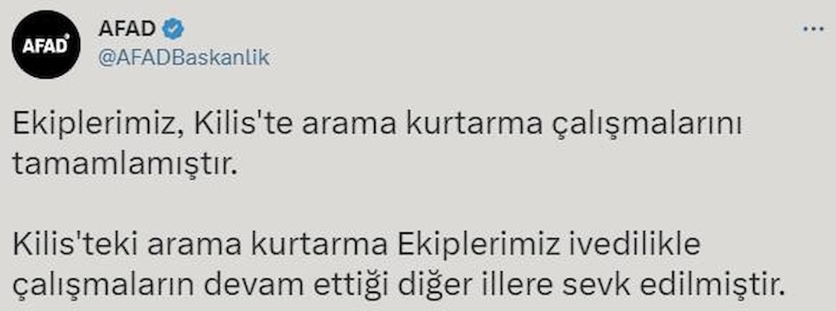 Ekiplerimiz, Kilis'te arama kurtarma çalışmalarını tamamlamıştır. Kilis'teki arama kurtarma ekiplerimiz ivedilikle çalışmaların devam ettiği diğer illere sevk edilmiştir.