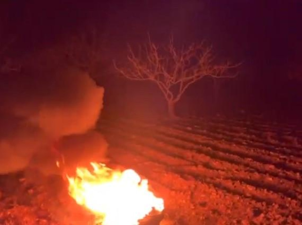 Soğuk havalarda yaşanabilecek don olayına karşı ağaçlarını korumak gayesiyle çiftçiler ağaç yakınlarında pamuk ve araç lastiği yaktı.